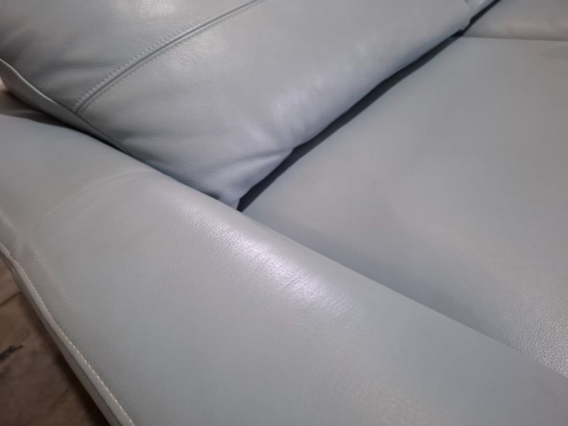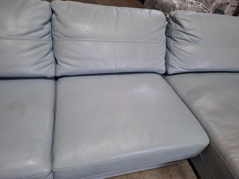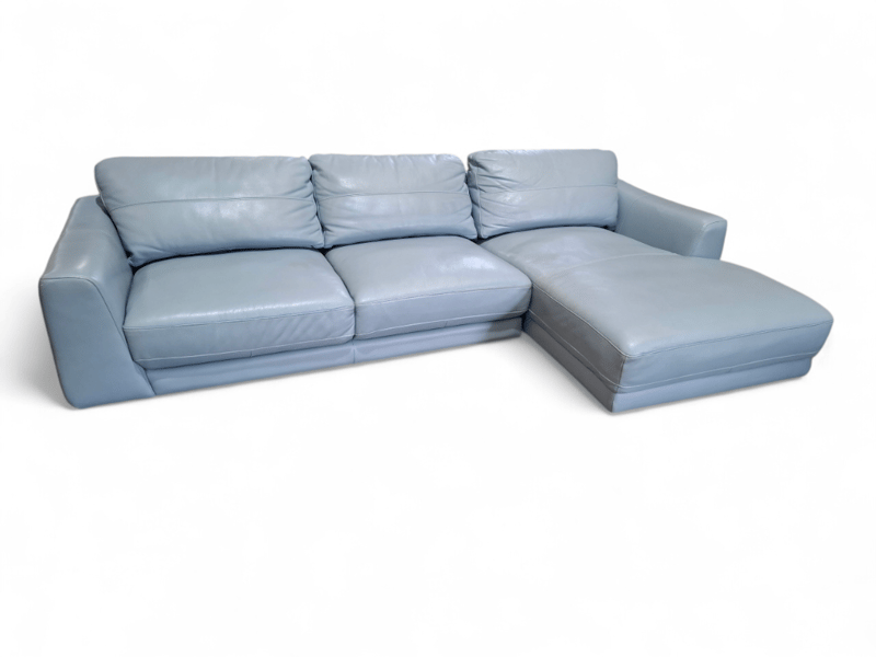 RRP $4190 3 seater lounge , chaise, pale blue leather, natural timber feet