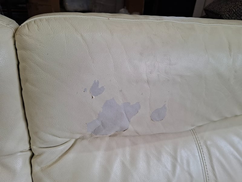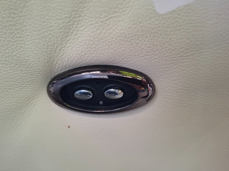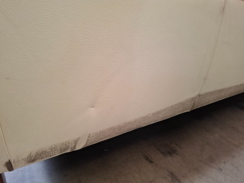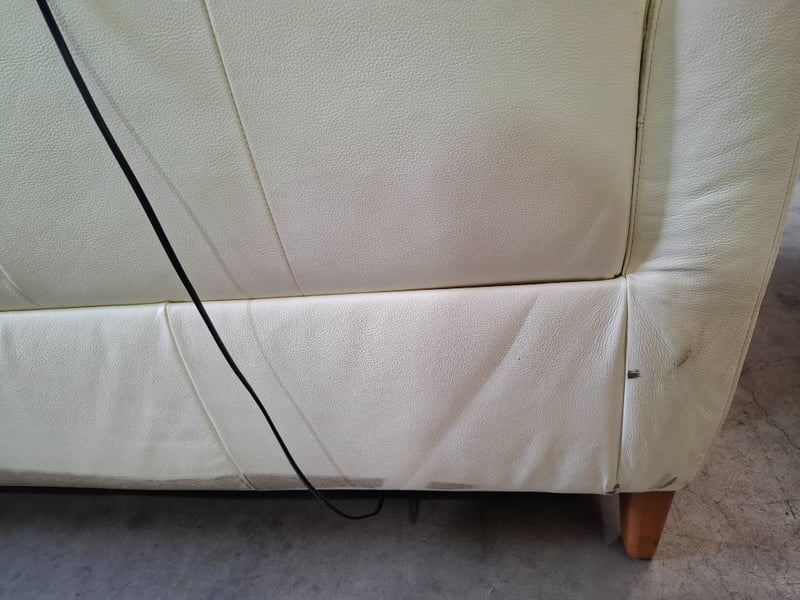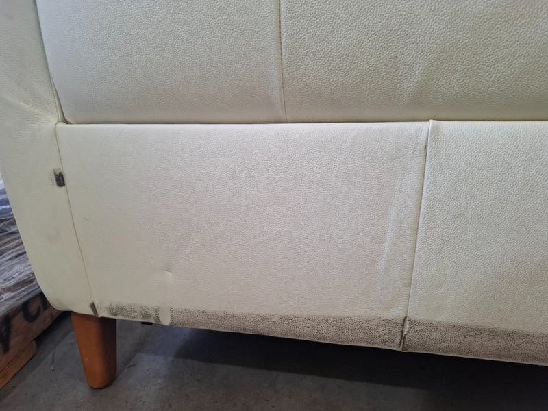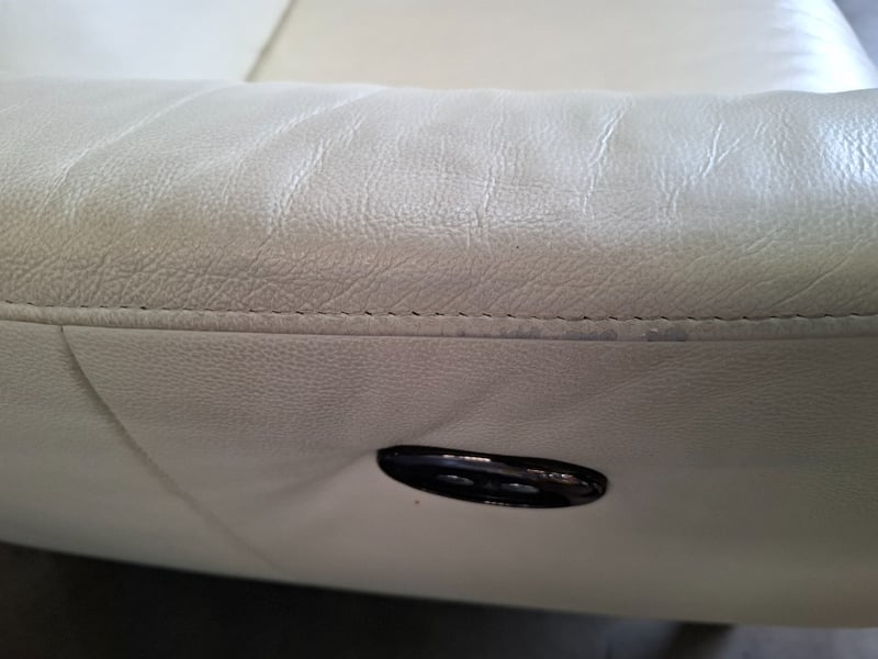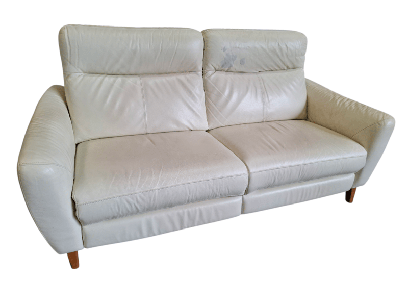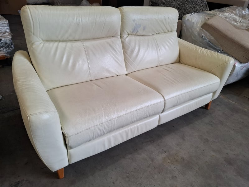 RRP $2799 2 seater ,electric recliner, colour beige leather, timber feet, USB ports Dimensions: 197cm(W)x 100cm(D)x 100cm(H) Note l: notable pealing off upholstery, scratches, cleaning required