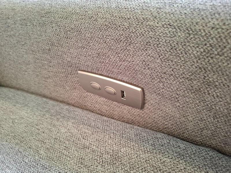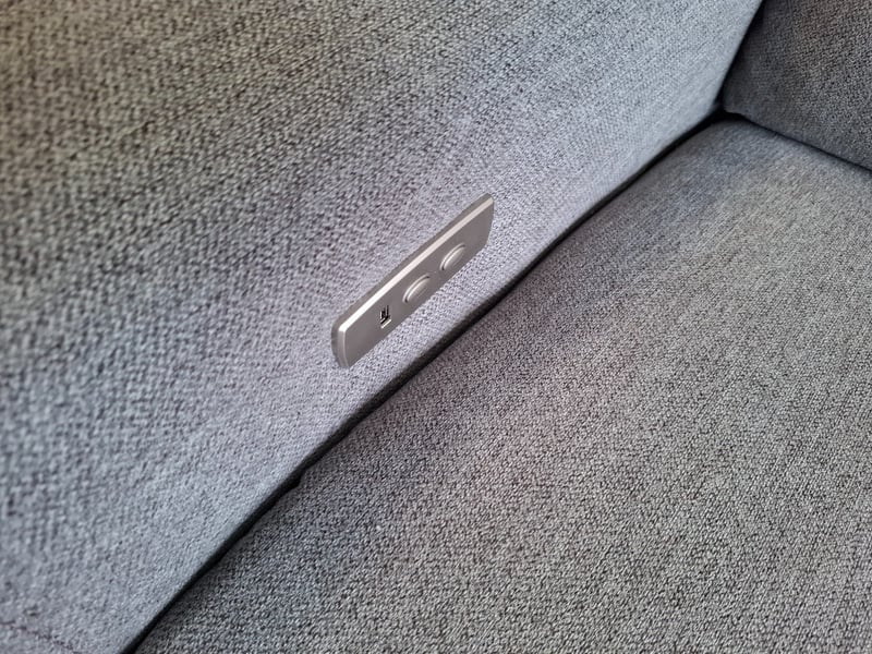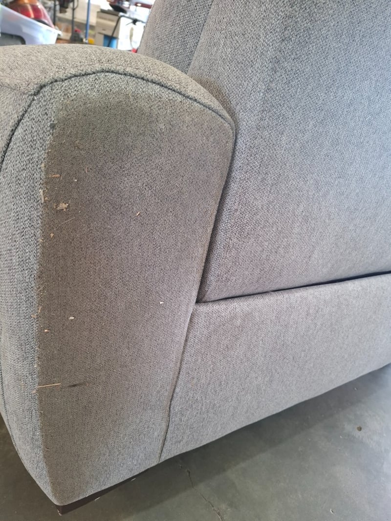 RRP $2490 2 seater ,electric recliner, fabric, colour grey , dark timber feet, USB ports