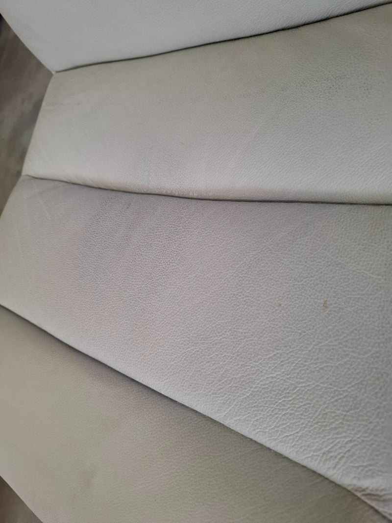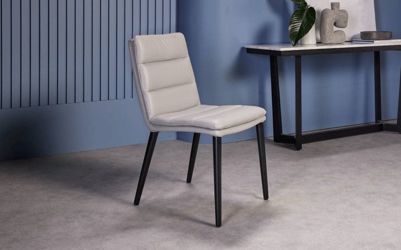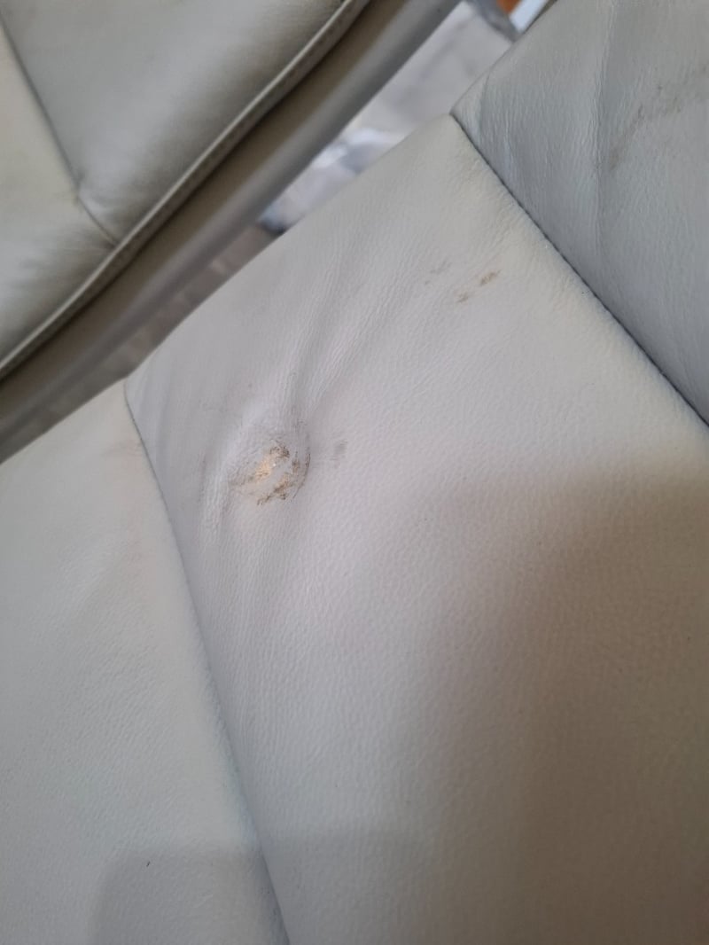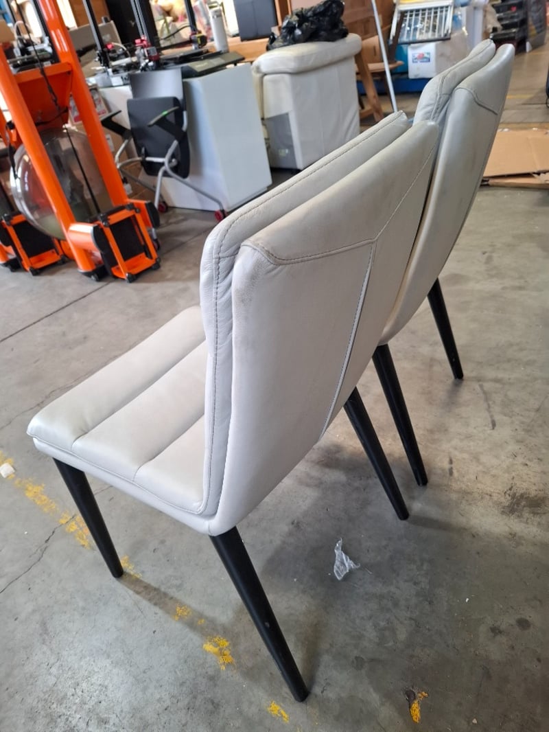 RRP $299, 2x light grey leather dining chairsNote: Scuffs, wear and tear, cleaning required