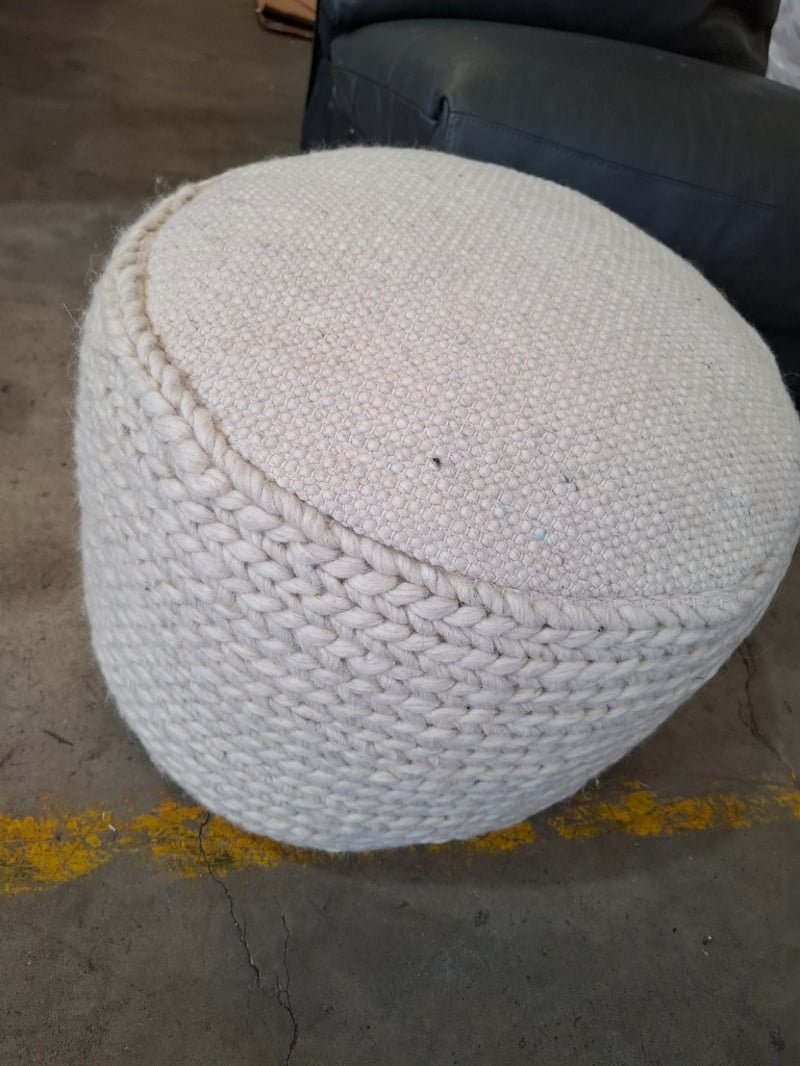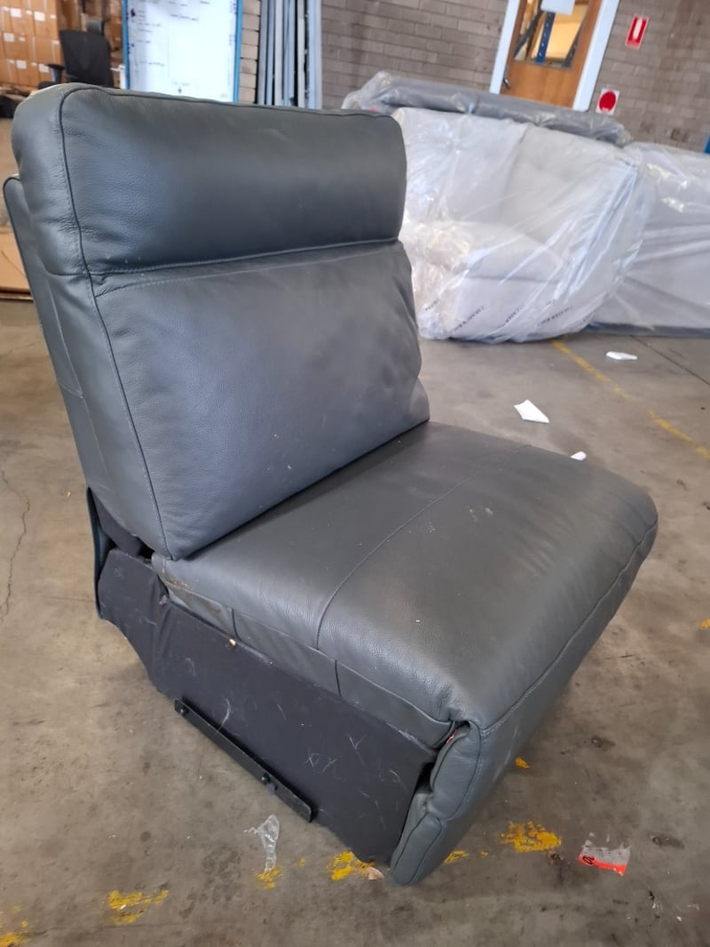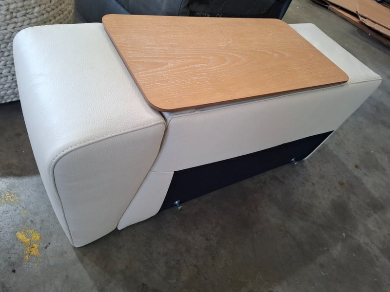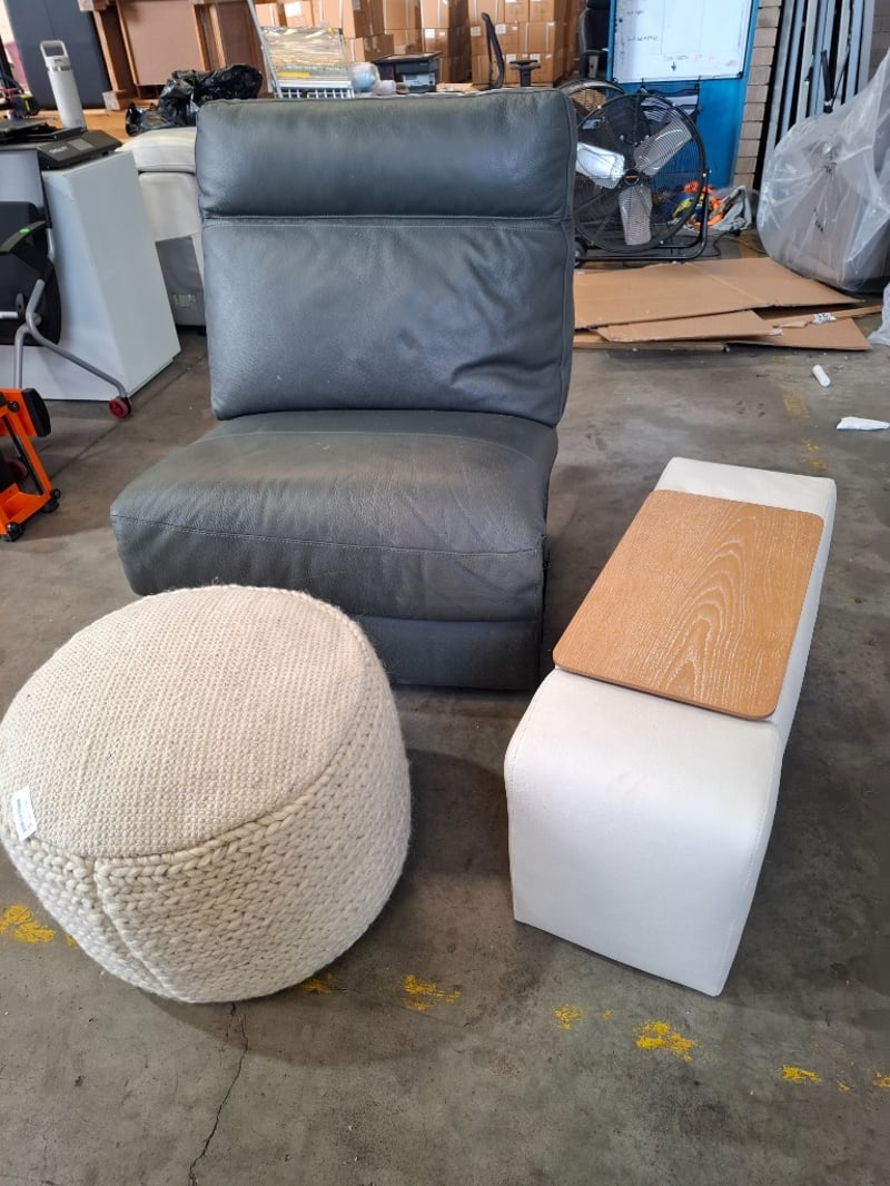1x Cream fabric texture stool , 1x single recliner middle part, grey leather , 1x Console storage cream leather with timber board Sold as lot
