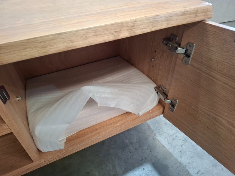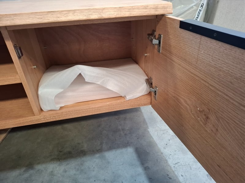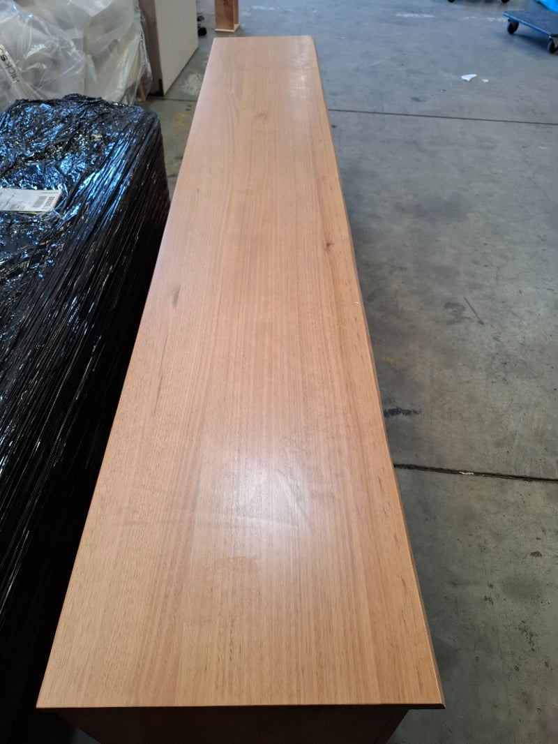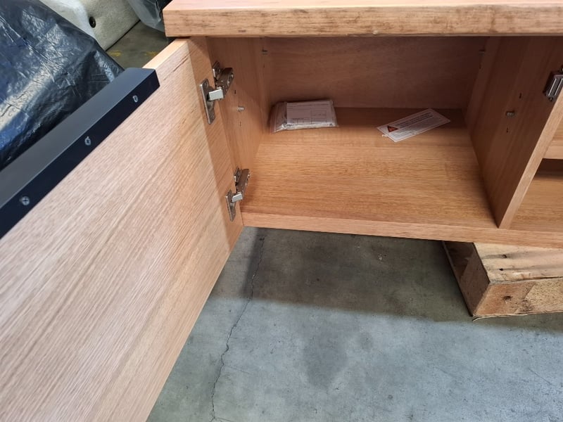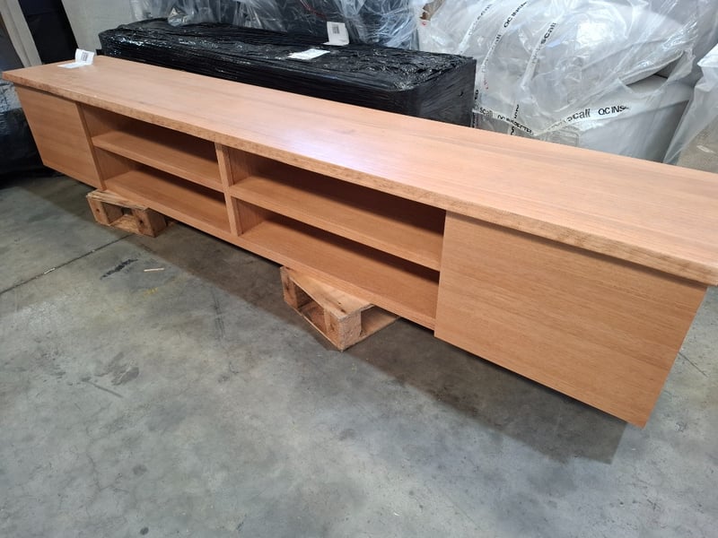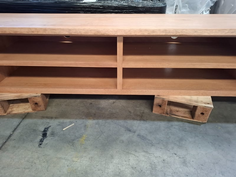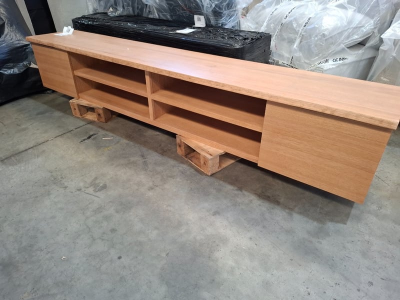 Wooden tv unit, natural timber wash finish, 2 doors, 4 shelves. No legs. Dimensions: 260cmW x 45cmD x 50cmH Note: Scratches, scuffs, Marks, Inspection recommend, cleaning required