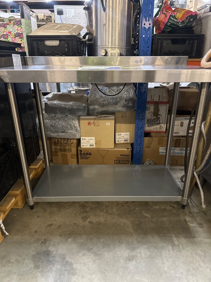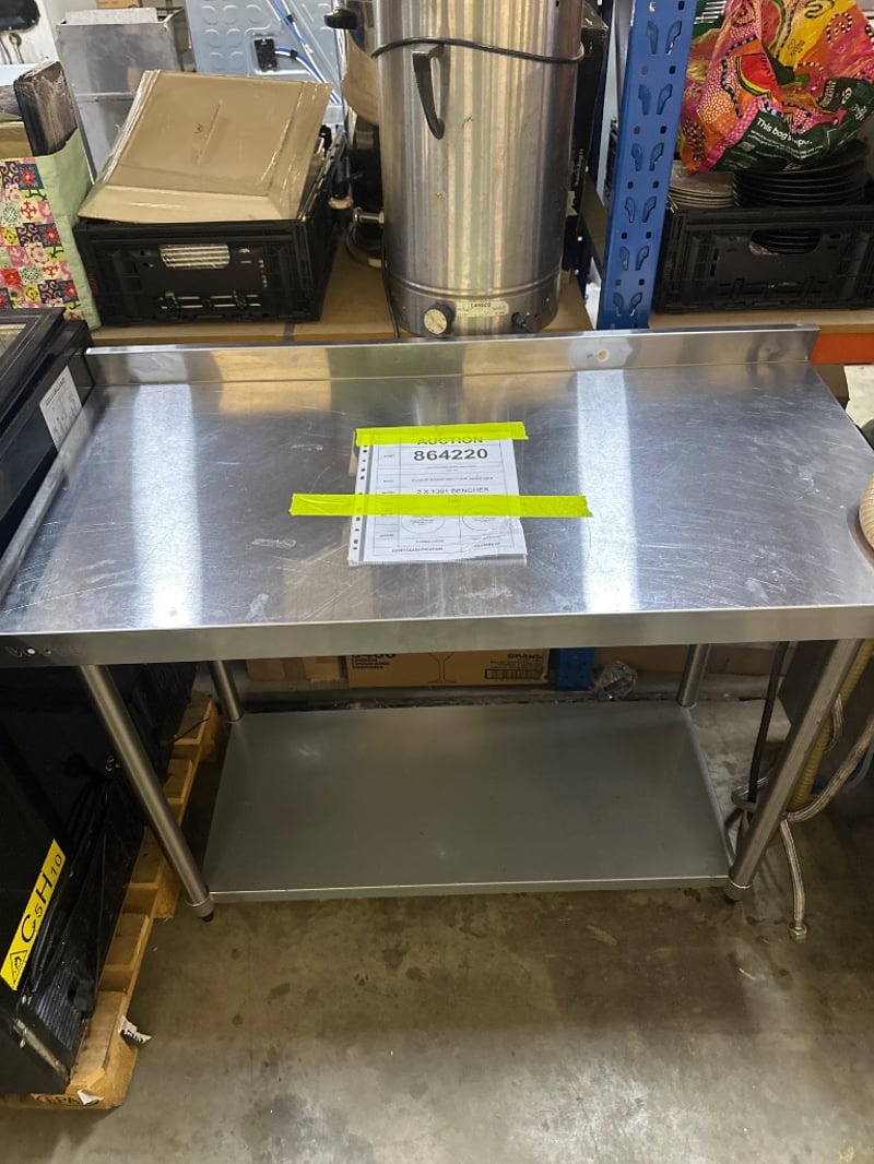 2 X VOGUE Stainless Steel Bench With BacksplashNOTE HAS SCRATCHES AND DENTS Dimensions W120cm, D60cm, H96cmSOLD AS LOT