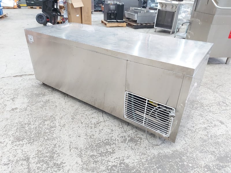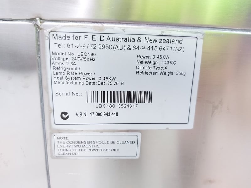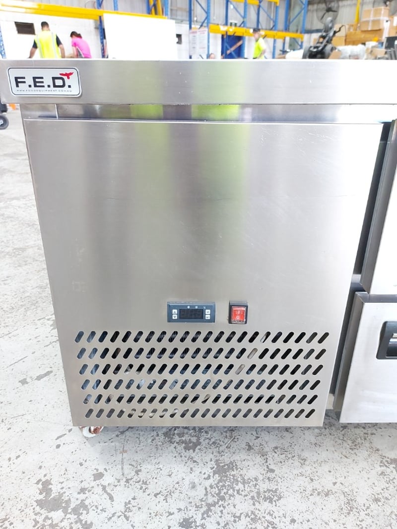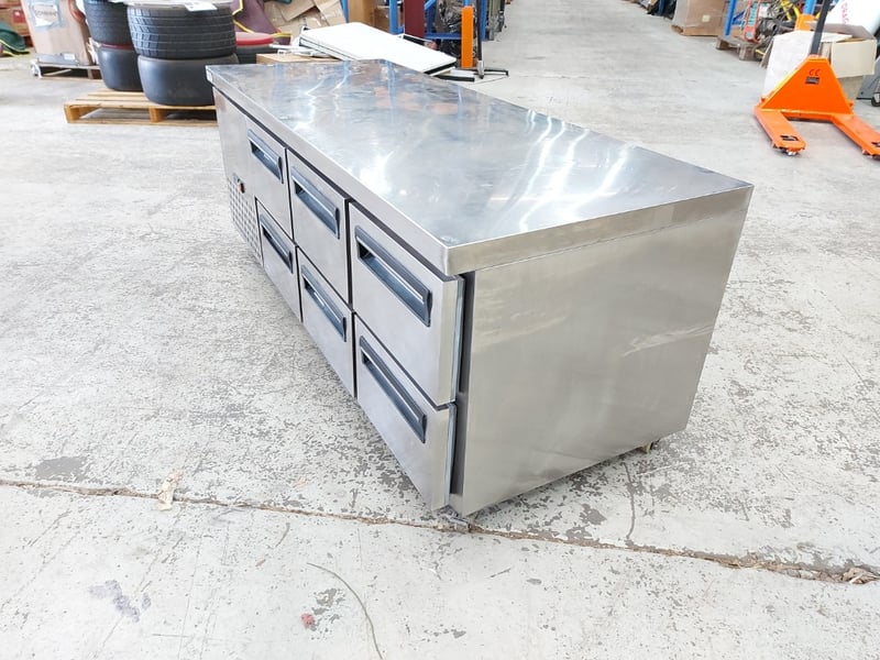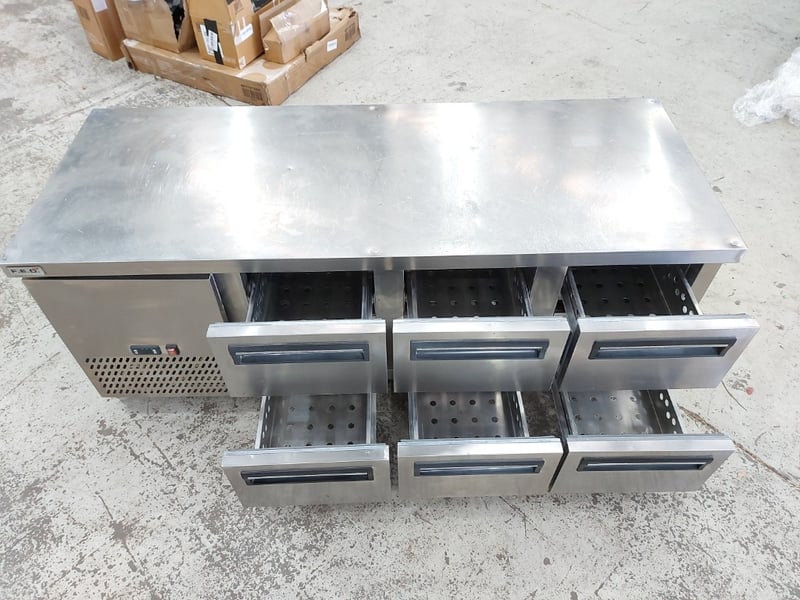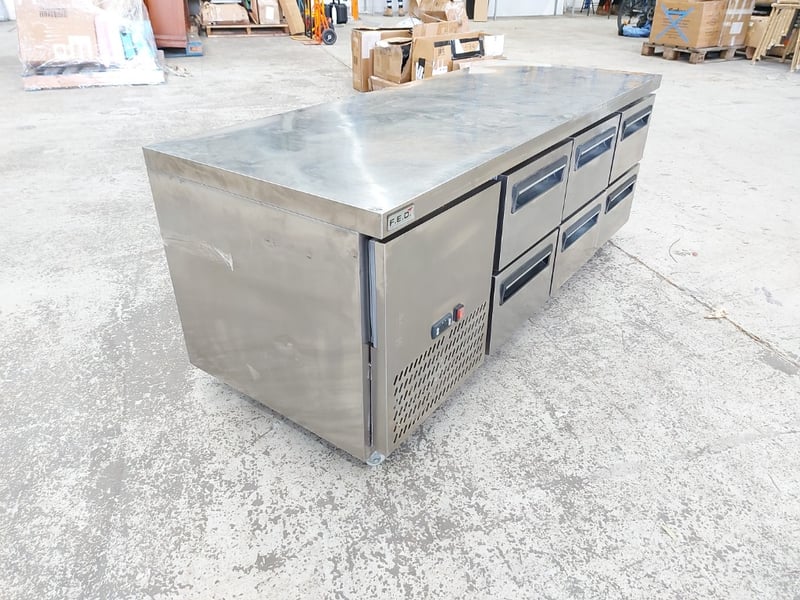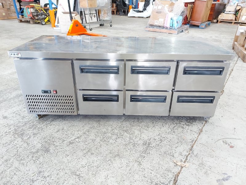 Federal undercounter bench fridge, M/N: LBC180, refrigerated, 6 draw, solid door, motor on LHS, 1 phase, 10 amp, stainless steel, undercount, scratches & dents. Dimensions: 180Wx 70Dx 70Hcm