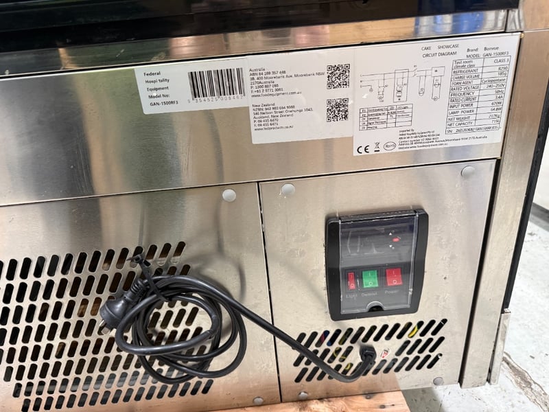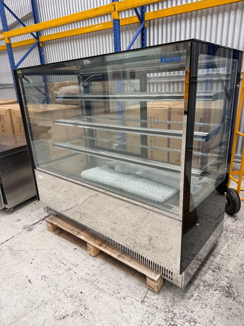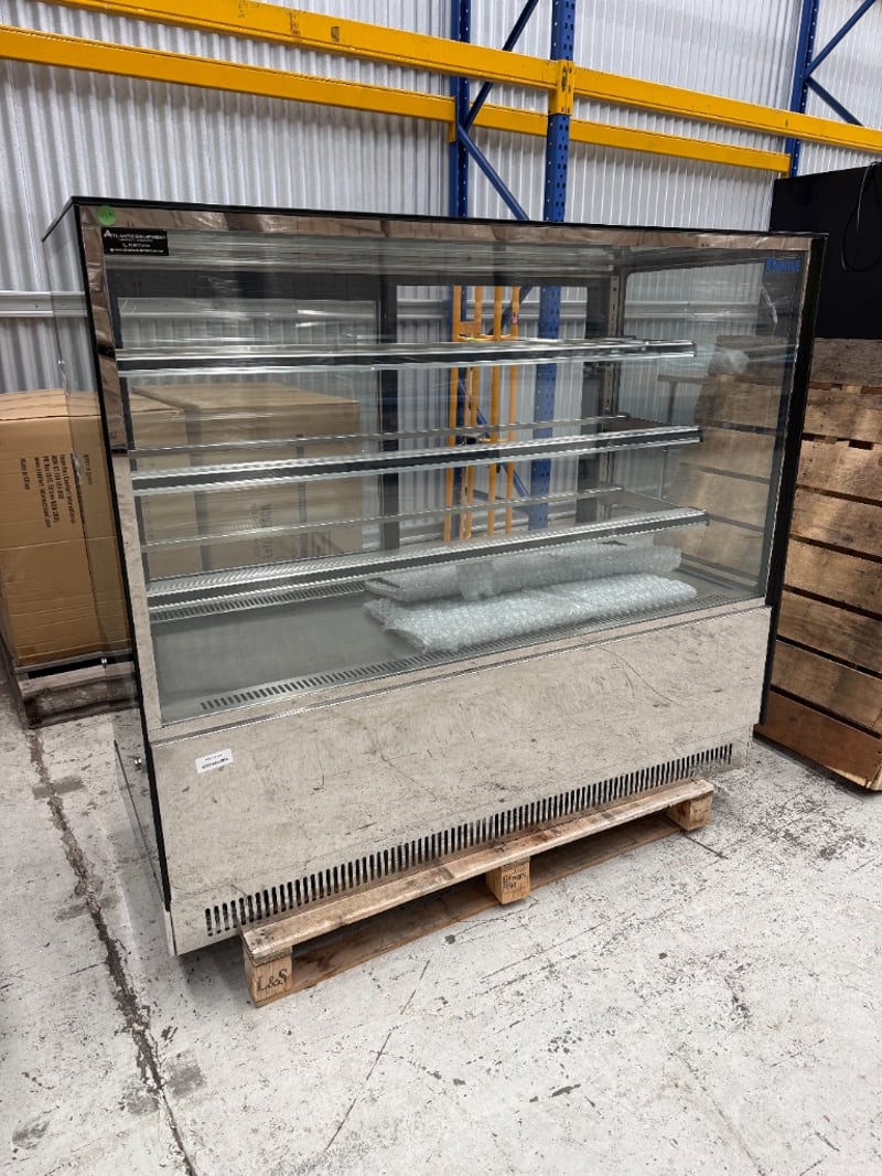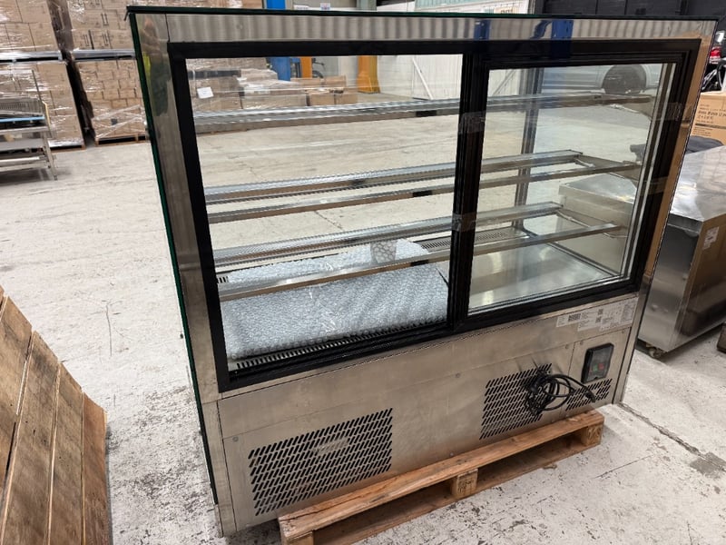 Bonvue Cake Display- Square Glass, Model: GAN-1500RF3, Refrigerated, 2 Door, Glass Door, Flat Glass, Motor on Bottom, 1 Phase, 10Amp, Stainless Steel, Freestanding, Scratches & Dents Approx Dimensions: 150Wx 73Dx 132H cm