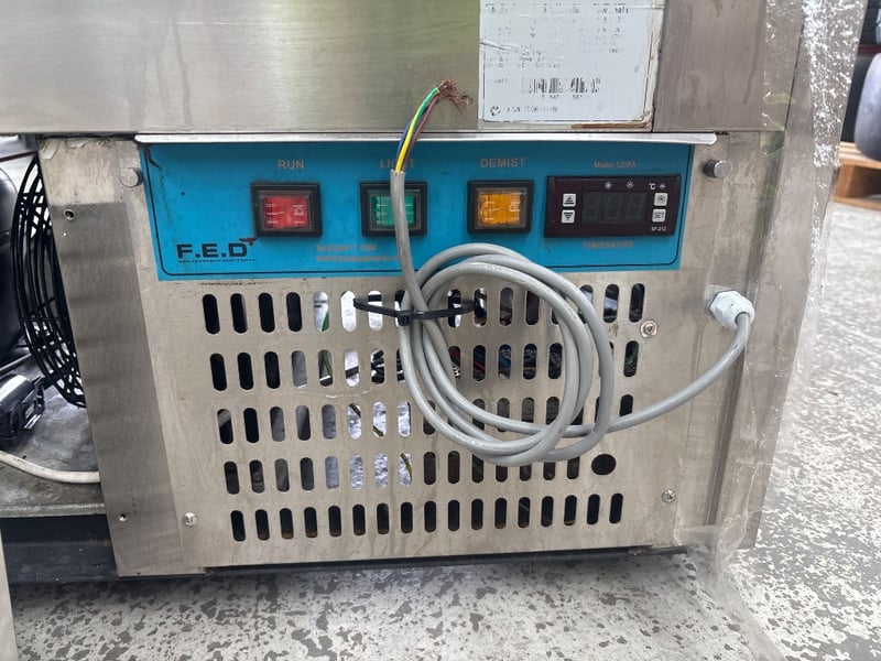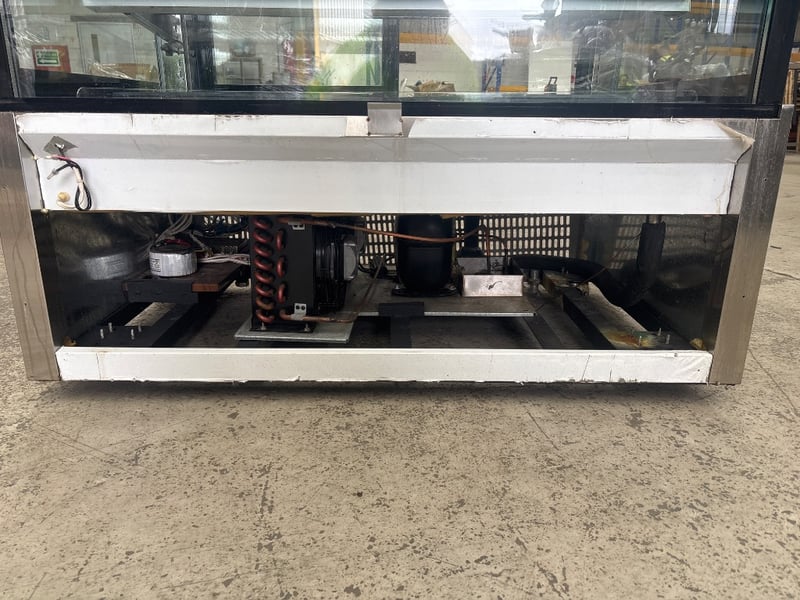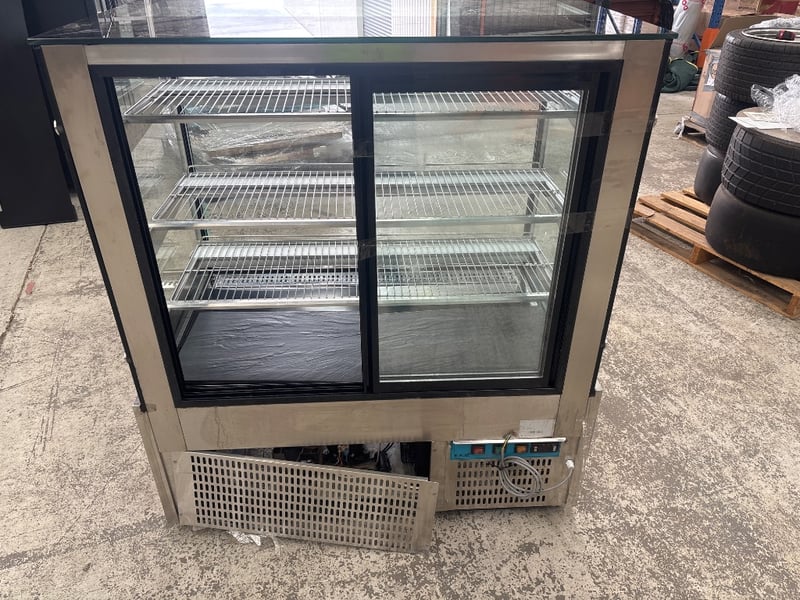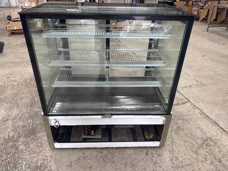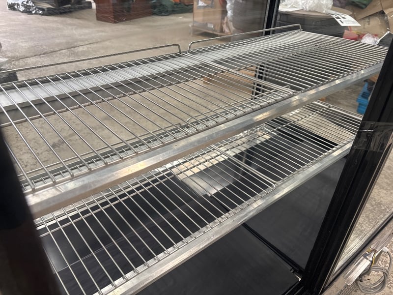 Display, Federal, cake display, square glass, model no. SL840V, serial no. 3656116, refrigerated, 2 door, flat glass, motor, 1 phase, 10 amp, black, stainless, freestanding, scratches and dents, includes two racking.