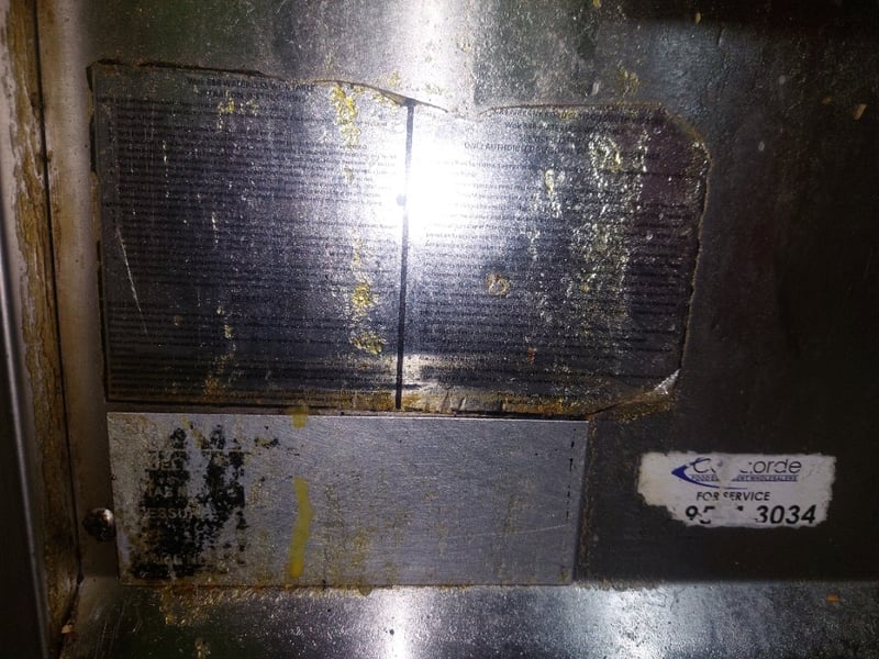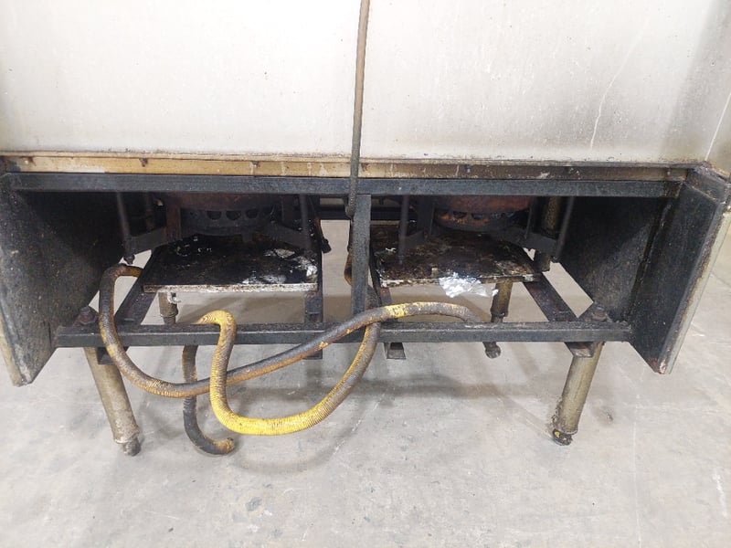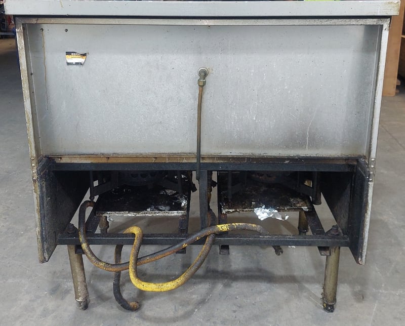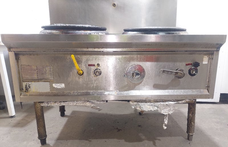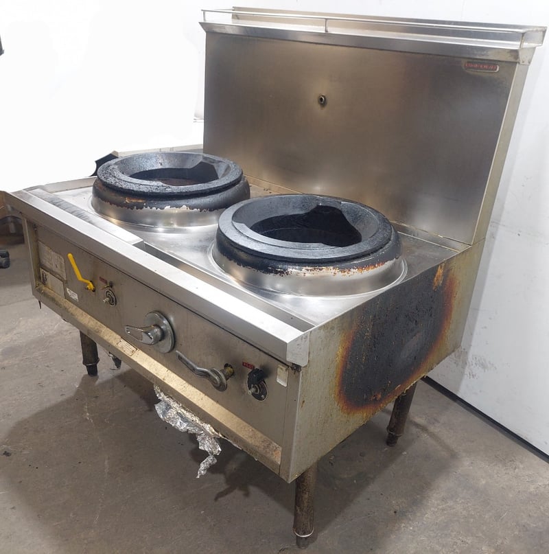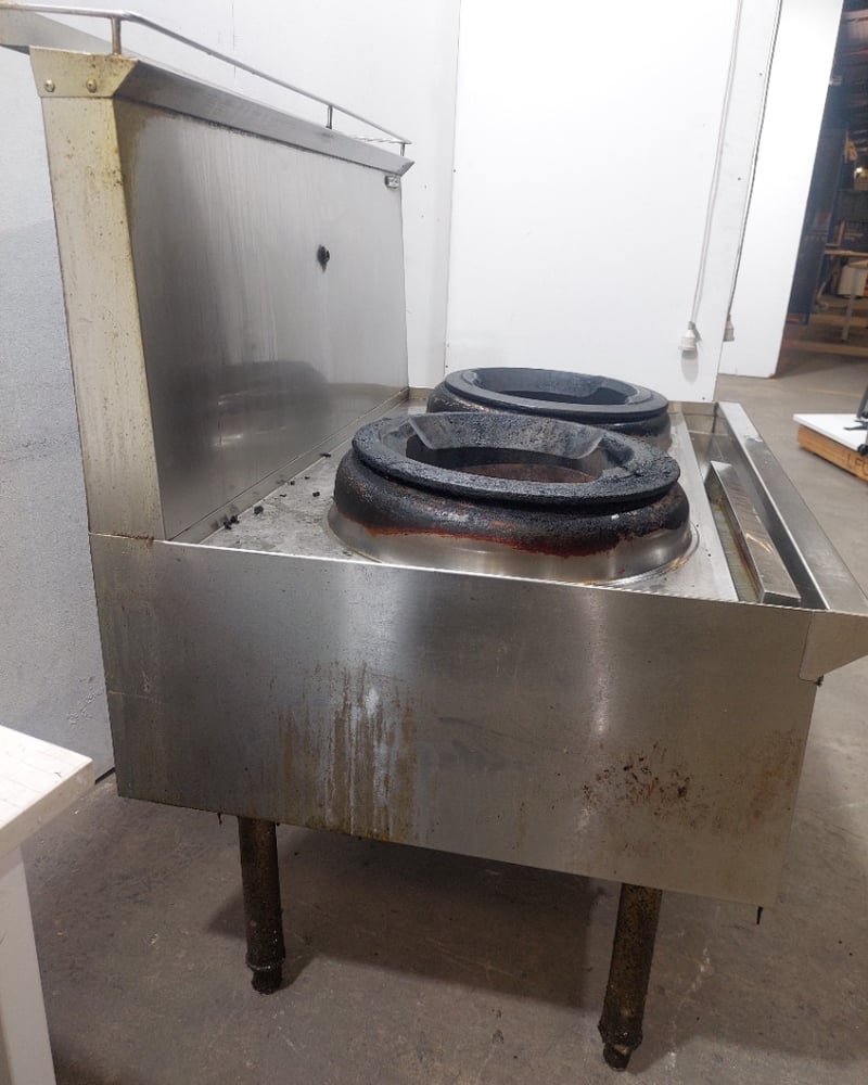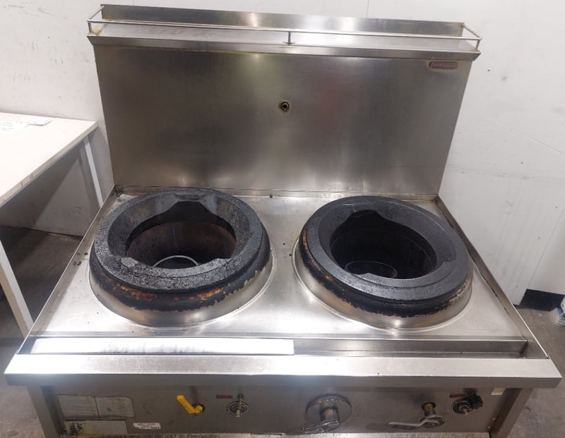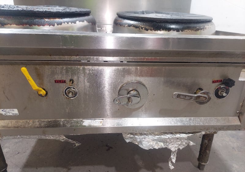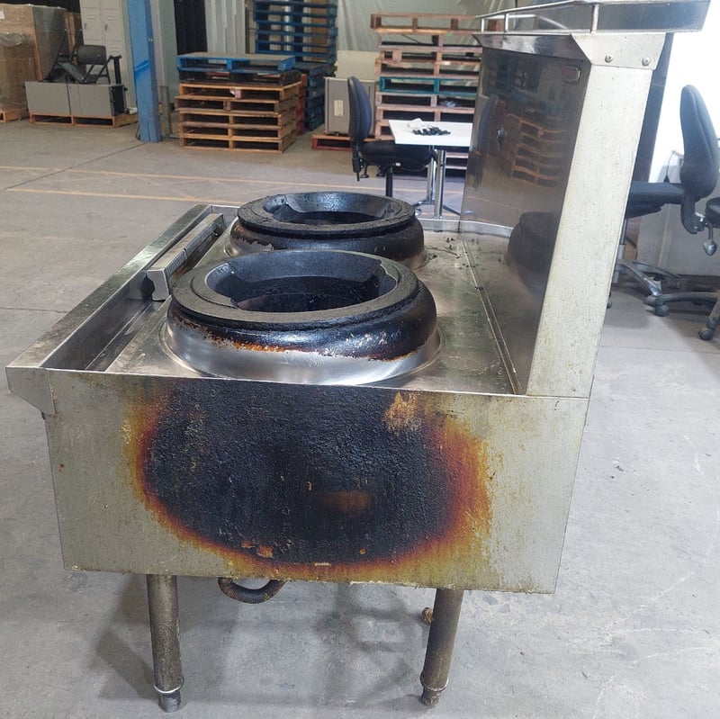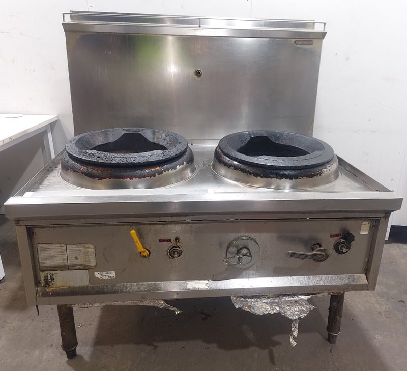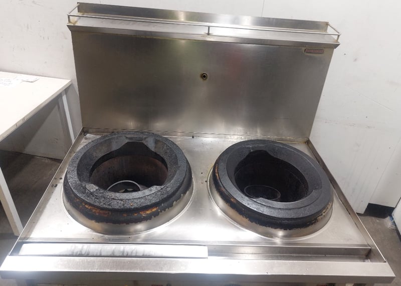 Commercial dual wok cooker station, stainless steel construction with two cast iron wok burners. Dims: 132cm H, 93cm W, 120cm L Features include stainless steel top cooking surface with integral splashback, control panel with yellow handle ignition switch and various operational knobs, visible gas supply lines with yellow protective wrapping, and enclosed base cabinet. Wok rings show significant carbon buildup and oxidation from heavy use. Equipment displays wear consistent with commercial kitchen environment. Some visible rust staining on base cabinet exterior. Note: item is untested, signs of wear.