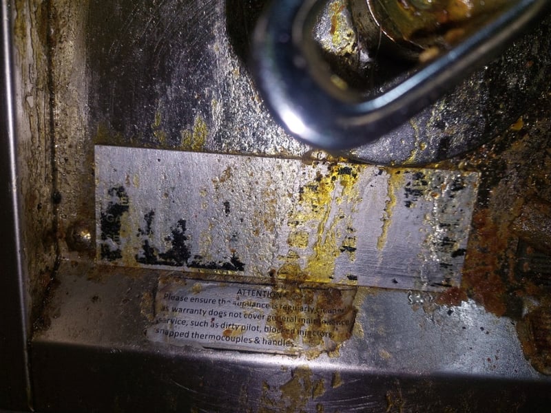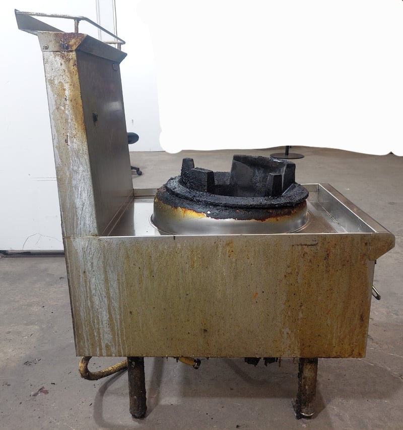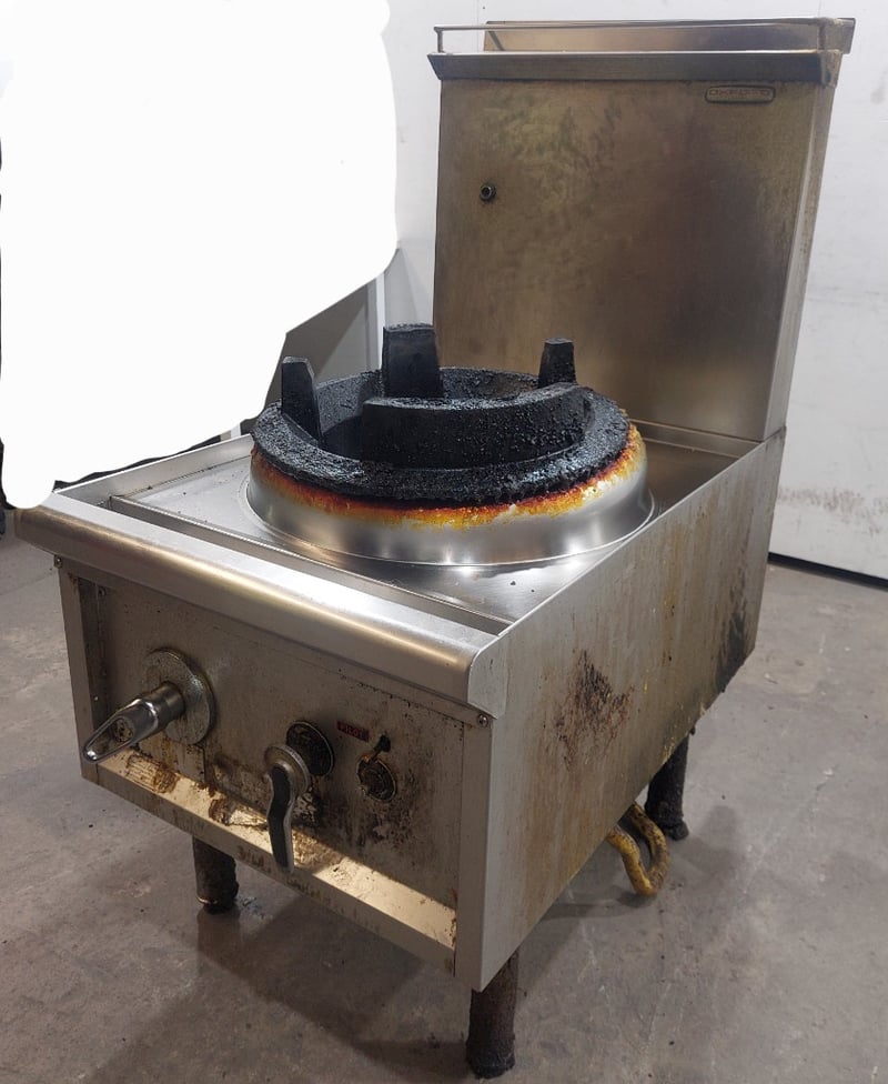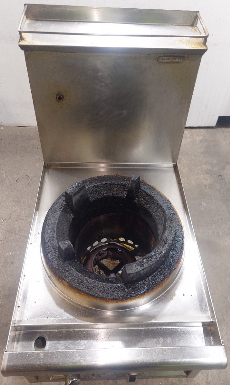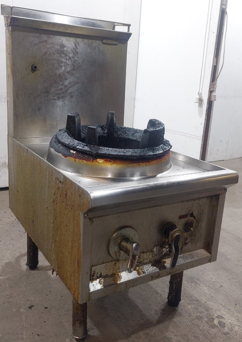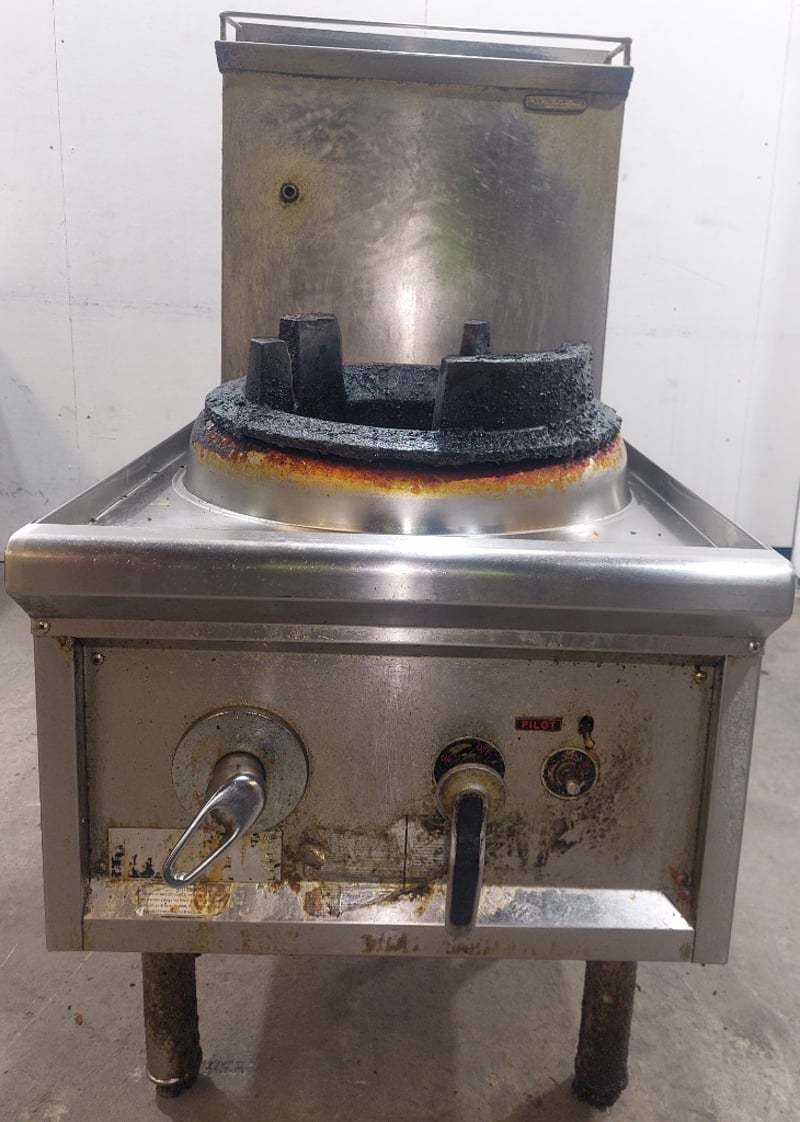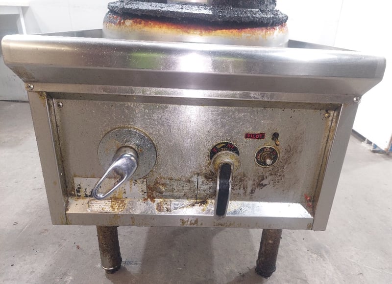 Heavy-duty commercial single-burner wok cooker featuring stainless steel work surface and mild steel body construction. Dims:121cm H, 90cm W, 60cm LEquipment displays significant wear with rust and corrosion throughout, indicating extensive use in a commercial kitchen environment. The unit is mounted on four welded steel legs and includes two control knobs on the front panel. The cooking vessel features a traditional round-bottomed wok ring with black cast iron grating, orange/rust-coloured thermal insulation ring, and four black cast iron supports forming a crown configuration. Large stainless steel drip pan sits beneath the burner assembly. Note: item is untested, signs of wear.