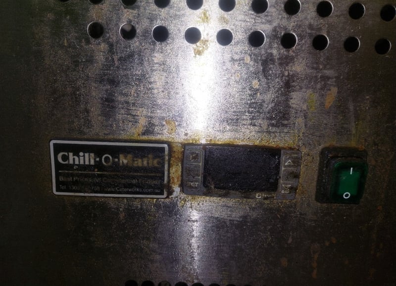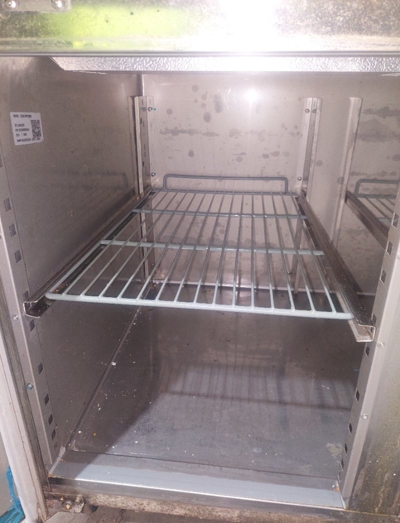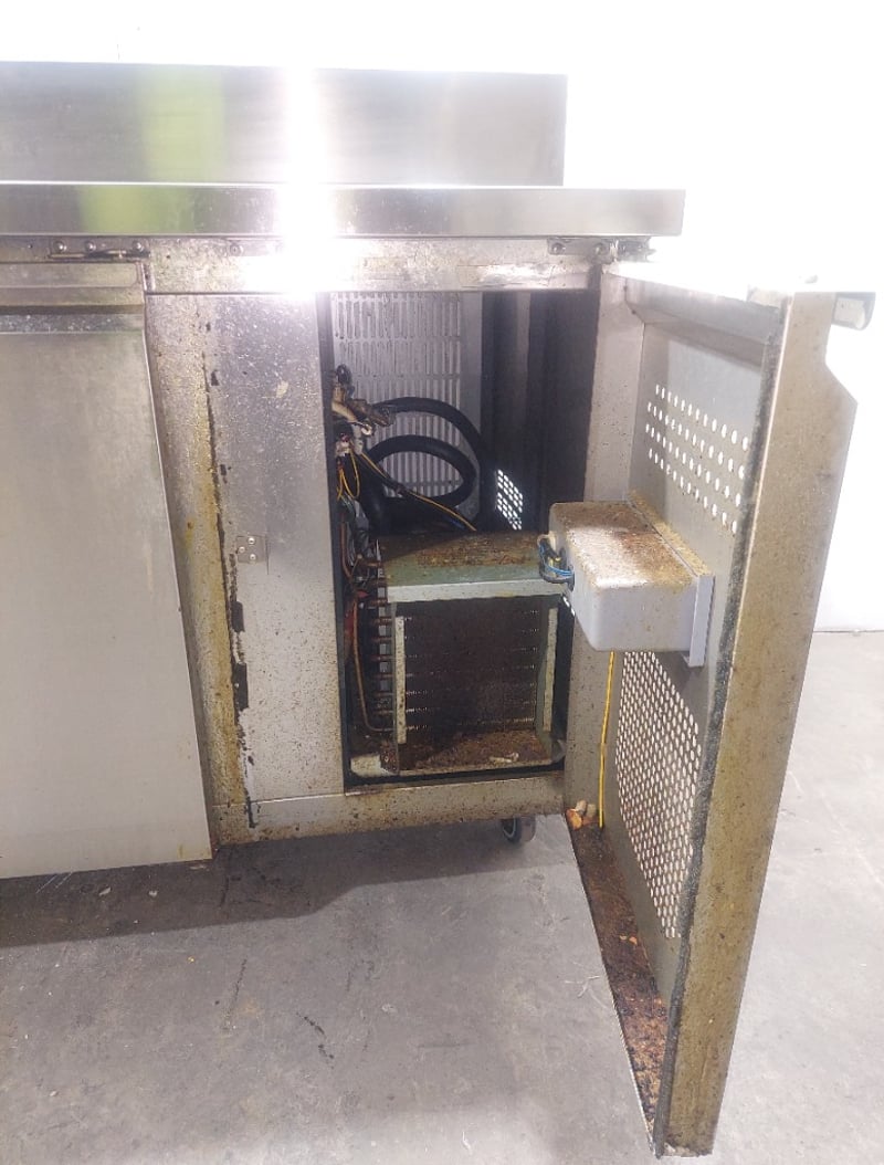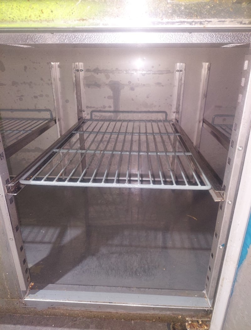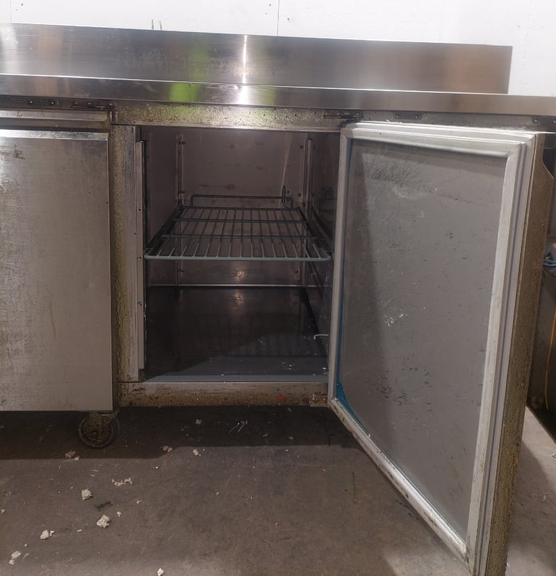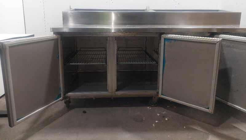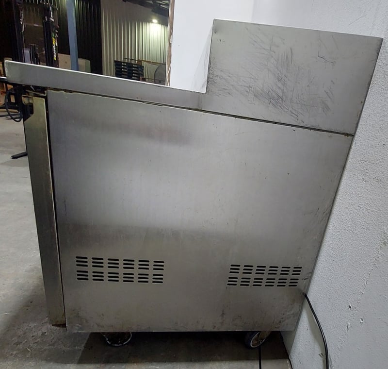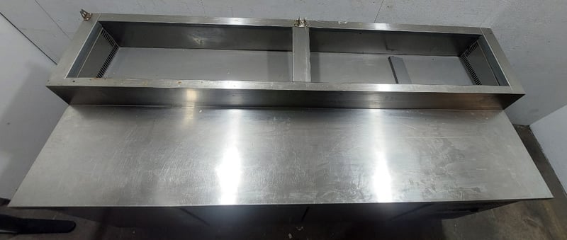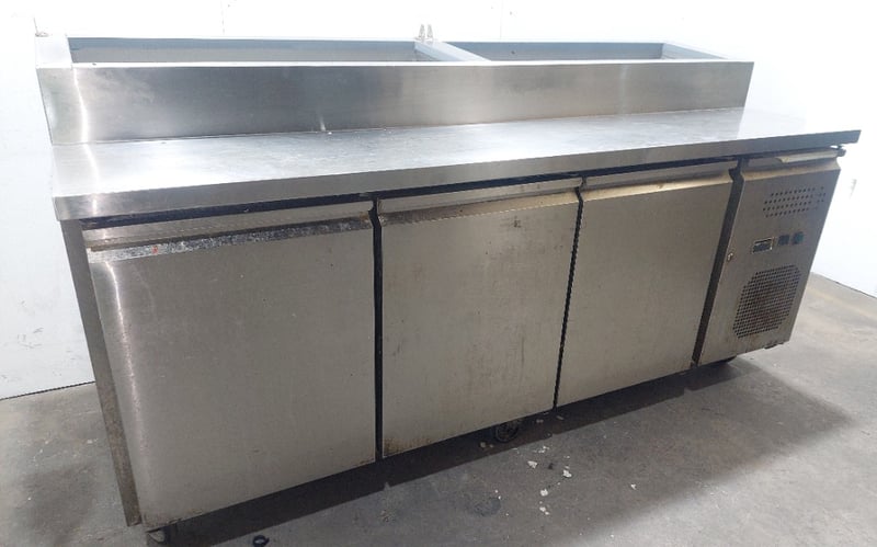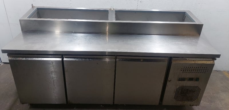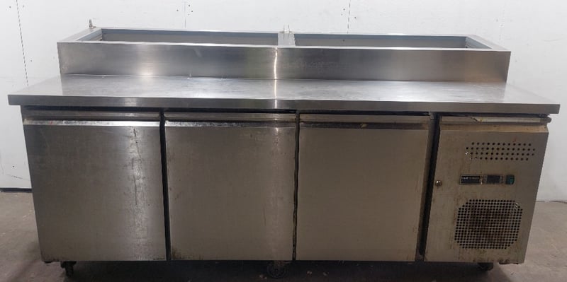 Heavy-duty stainless steel commercial refrigerated prep counter featuring three full-width under-counter refrigerated compartments with solid doors, plus one reach-in refrigeration unit on the right end. Model:CWX-PPF2000 Serial number: 246292 Dims:109cm H, 80cm W, 202cm L The unit includes a spacious stainless steel work surface with integrated sink basin (divided into two compartments) positioned above the refrigerated base. All compartments feature wire shelving and individual temperature controls. The equipment bears a "Chill-O-Matic" brand nameplate and operates on R290 refrigerant. The counter shows operational wear consistent with commercial kitchen use, including surface patina and minor corrosion. Mobile on castors for flexibility in kitchen layouts. Suitable for pizzerias, delis, or food preparation facilities requiring integrated refrigeration and work surface combination. Note: items is untested,signs of wear.