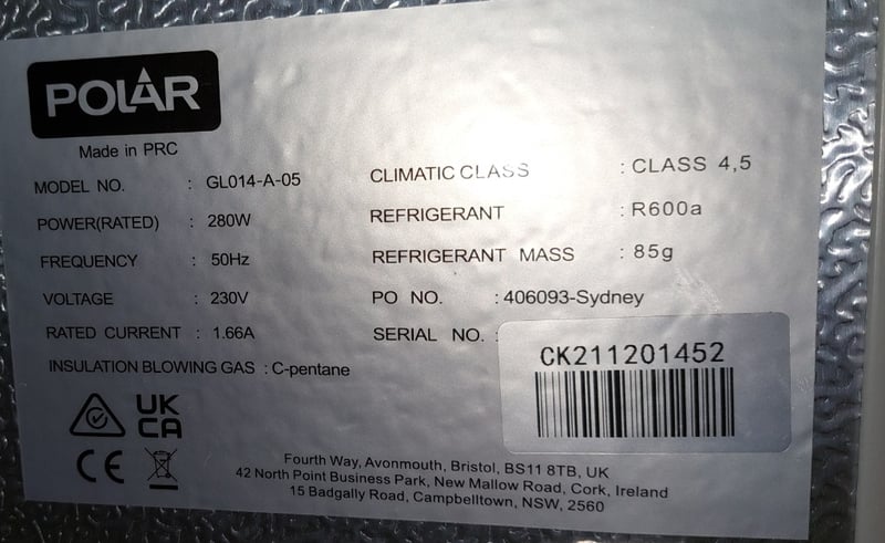 Polar G-Series Back Bar Cooler.Model: GL014-A-05Serial number: CK211201452Dims: 83cm H, 50cm W, 135cm LNote: item is untested, signs of wear.