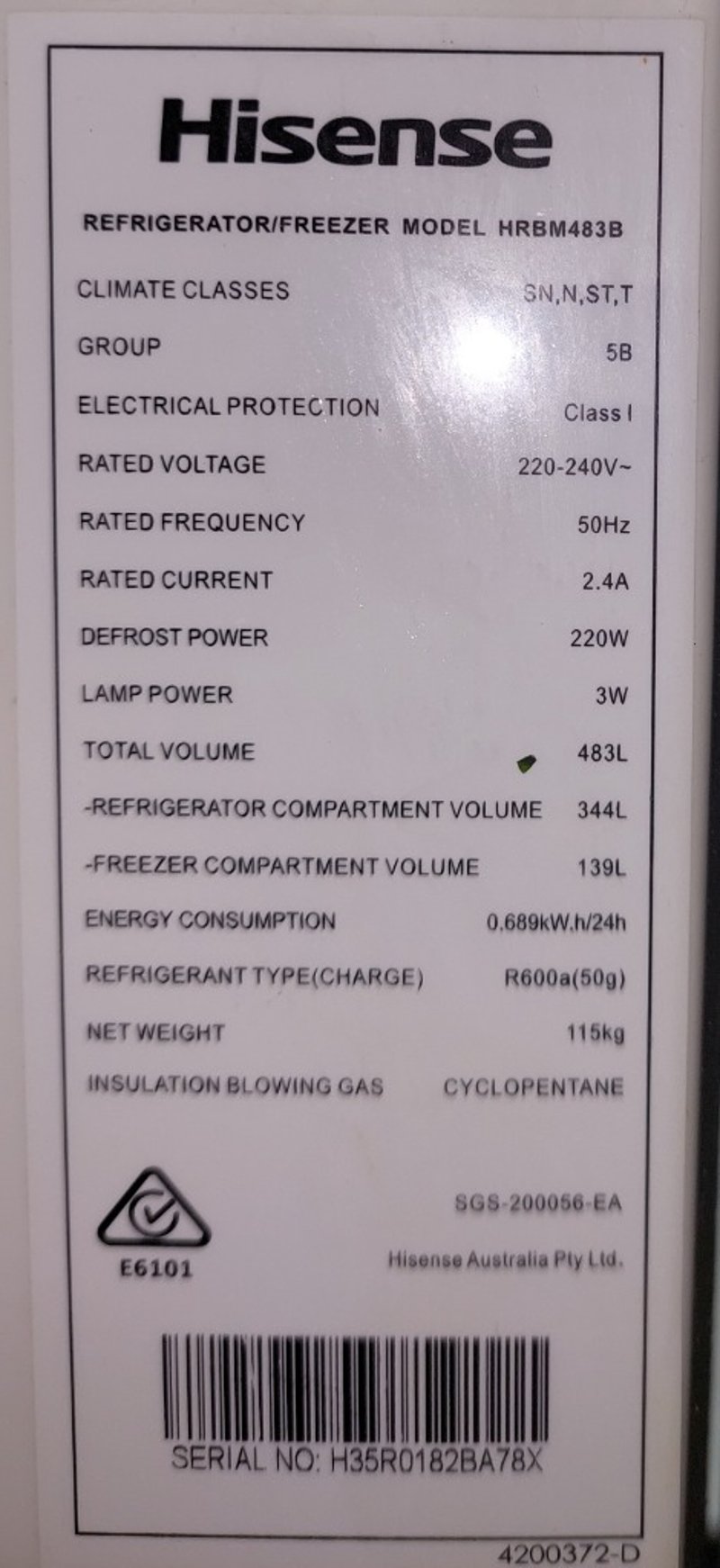 Hisense 483L PureFlat Bottom Mount Refrigerator.Model: HRBM484BSerial number: H35R0182BA78XDims:174cm H, 68cm W, 79cm LNote: item is untested, signs of wear.