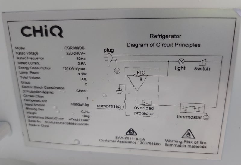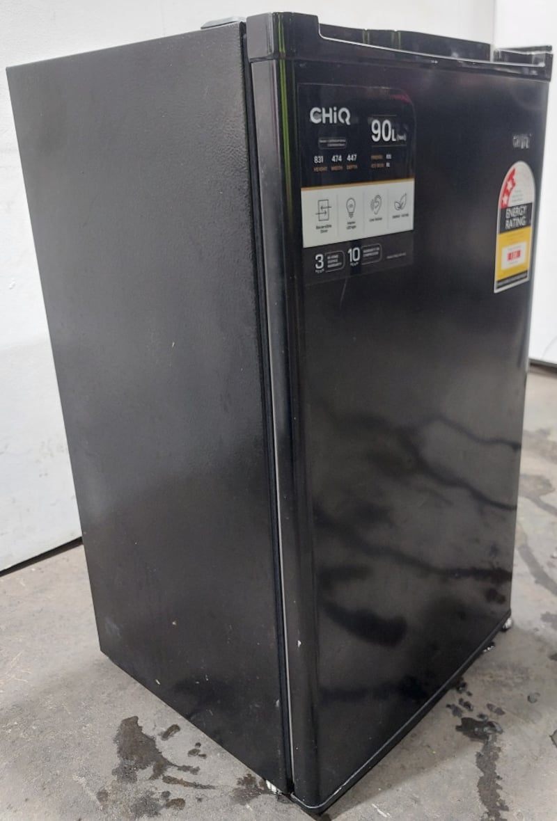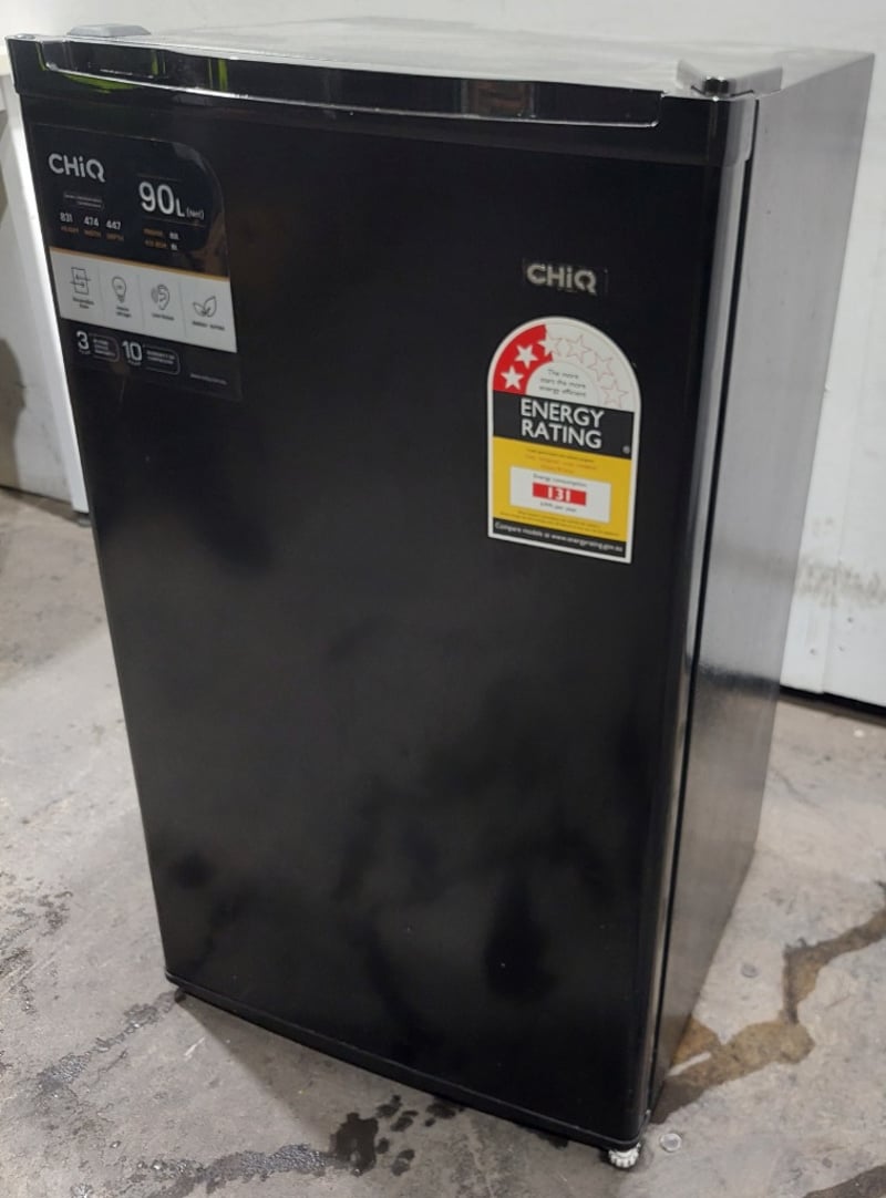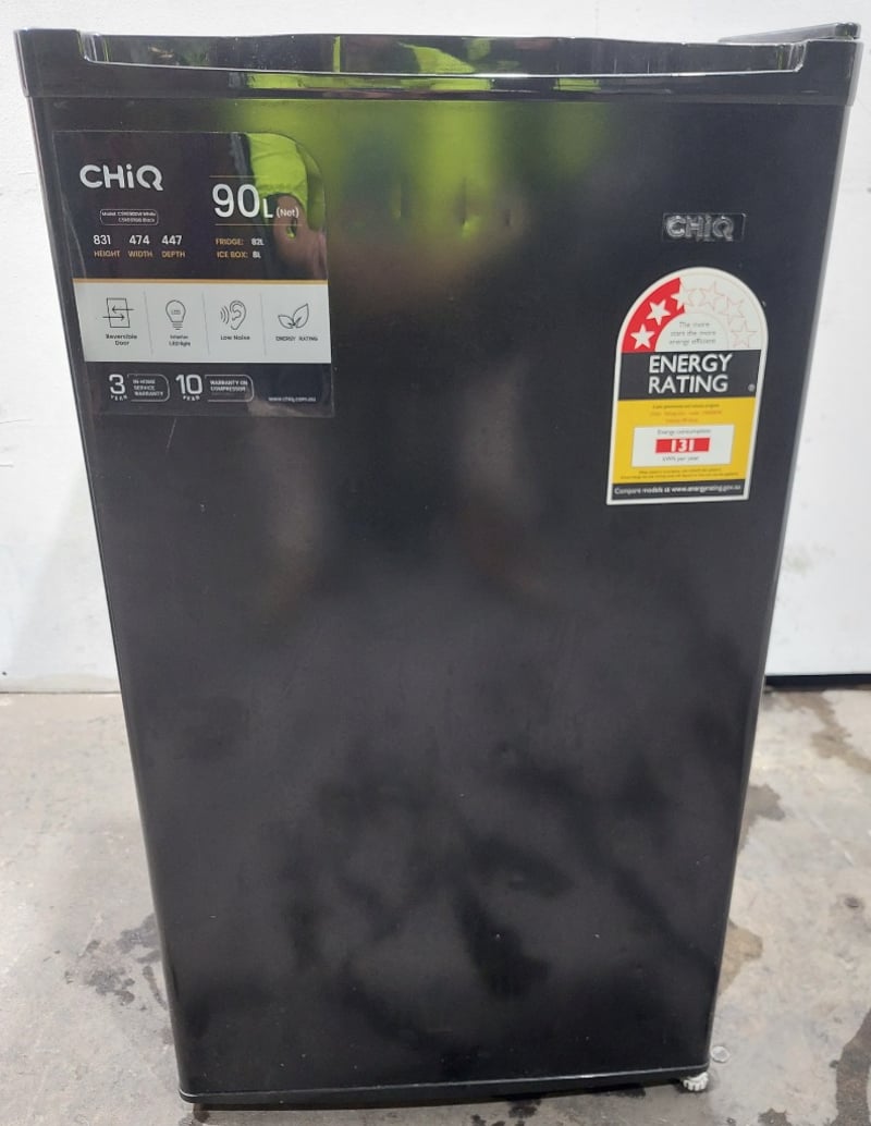 CHiQ 90L single door bar fridge in black.