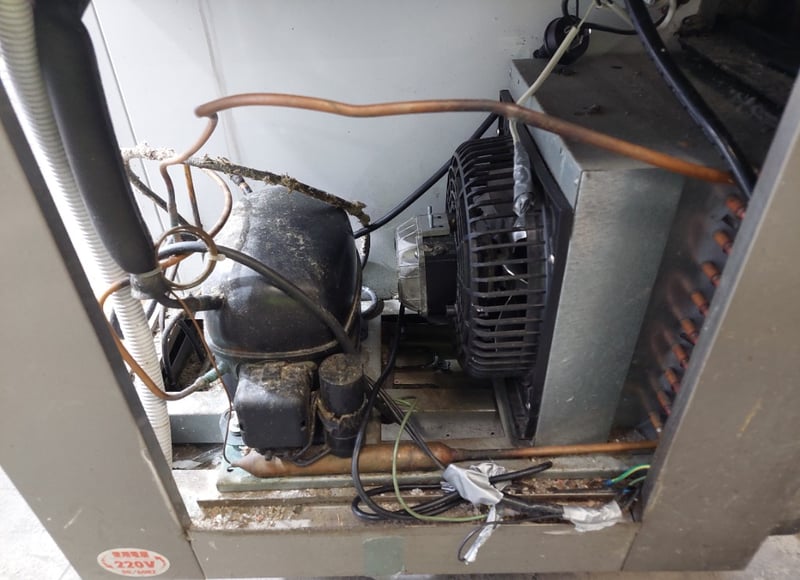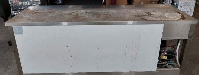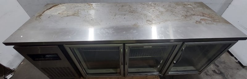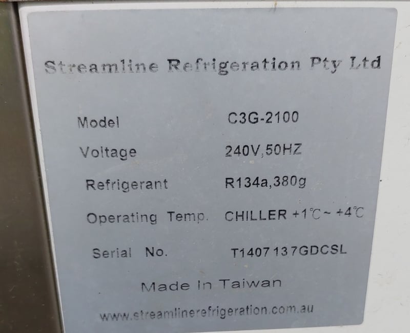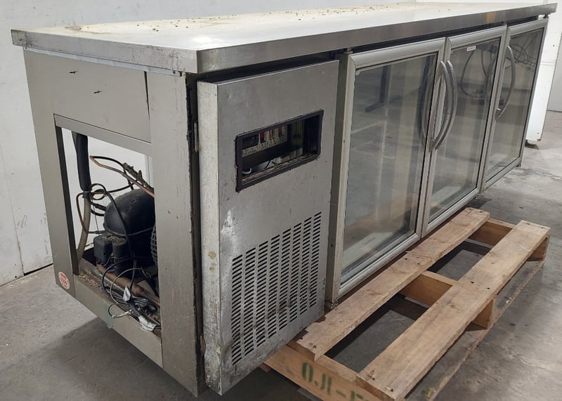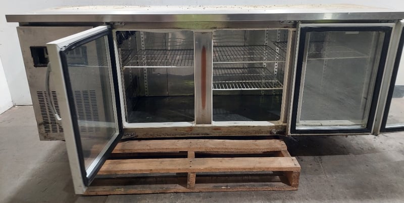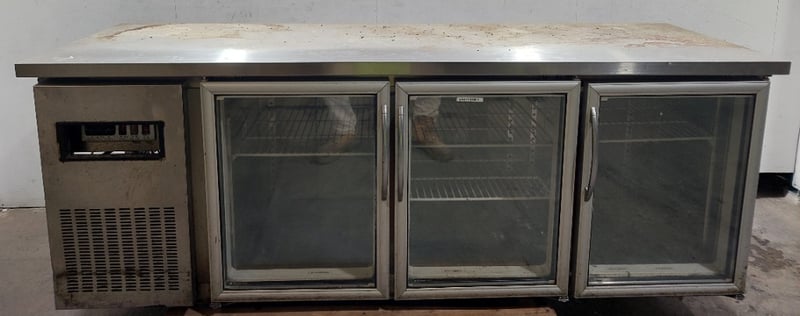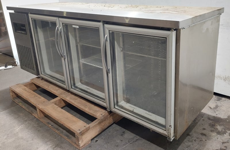 Streamline three-door under-bench glass door fridge.