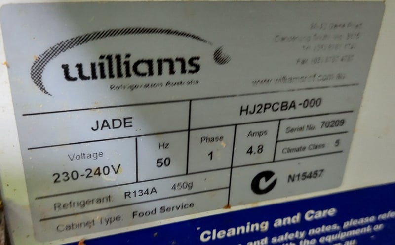 Williams Jade 2 Door Preparation Fridge with wheels.Model: HJ2PCBA-000Serial number: 70209Dims:106cm H, 83cm W, 182cm LNote: item is untested, signs of wear.