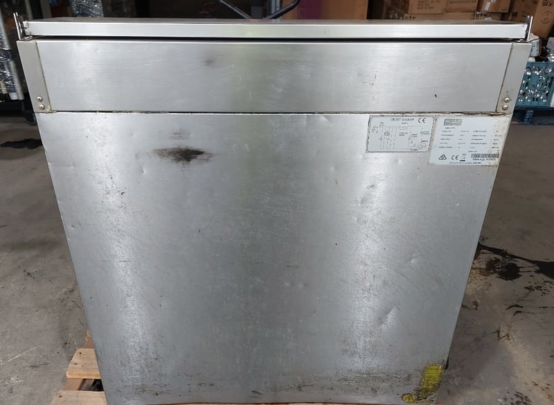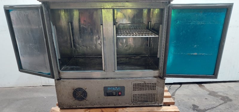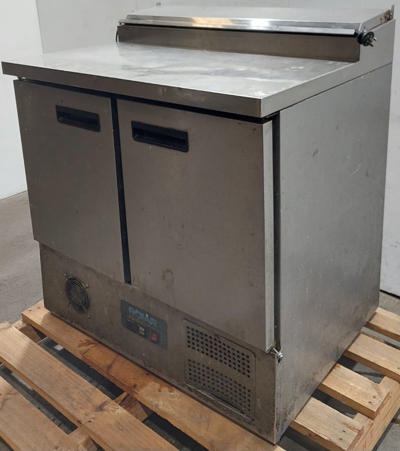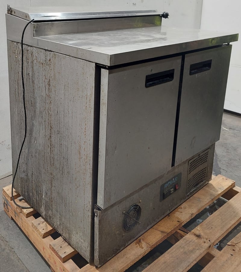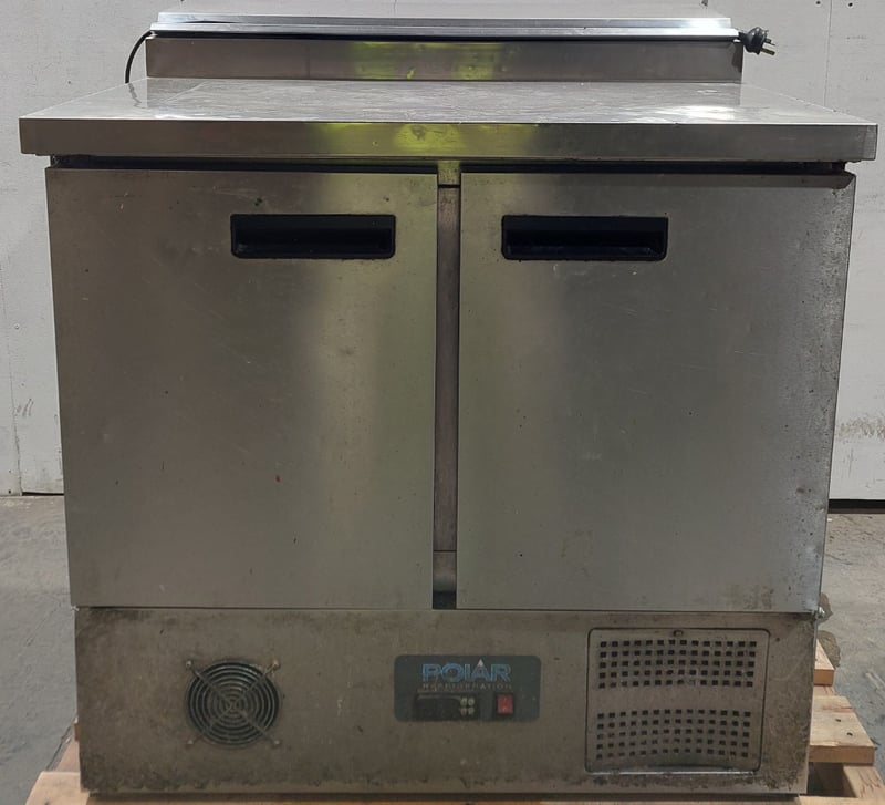 Polar G-Series 2-door commercial pizza and salad prep counter fridge.Model: G604-A-02Serial number: G604-A-02 8088670Dims:100cm H, 70cm W, 90cm LNote: item is untested, signs of wear.