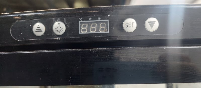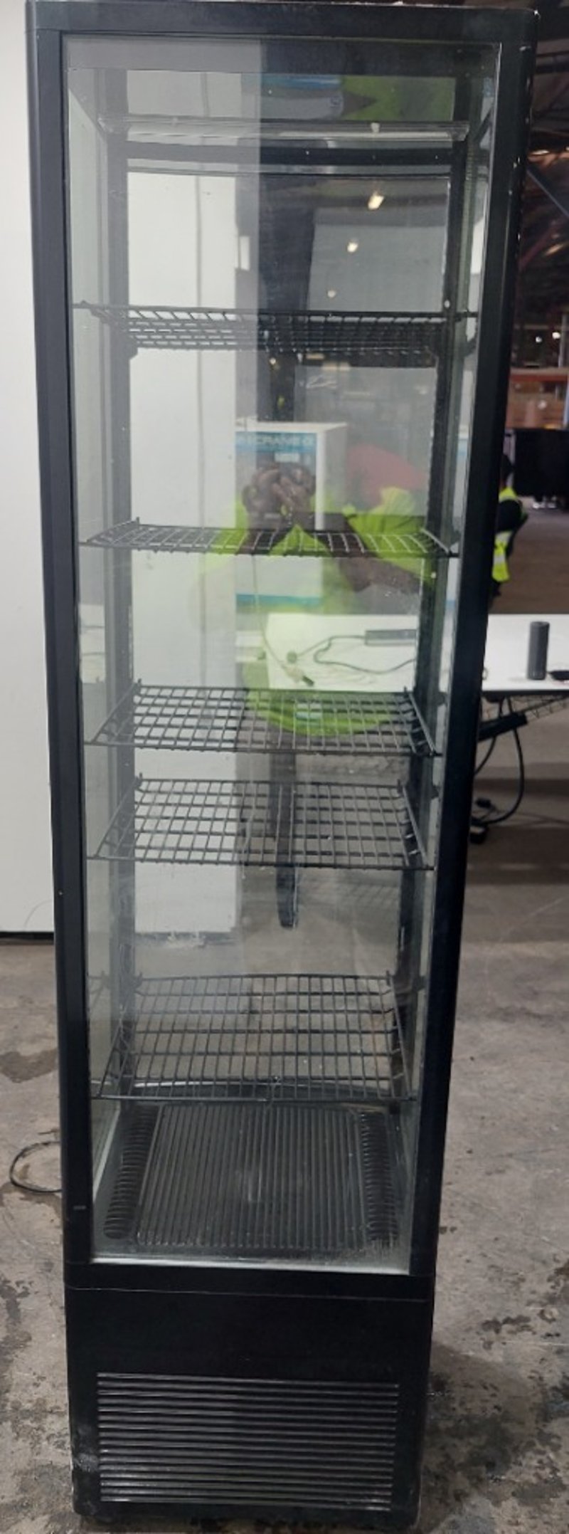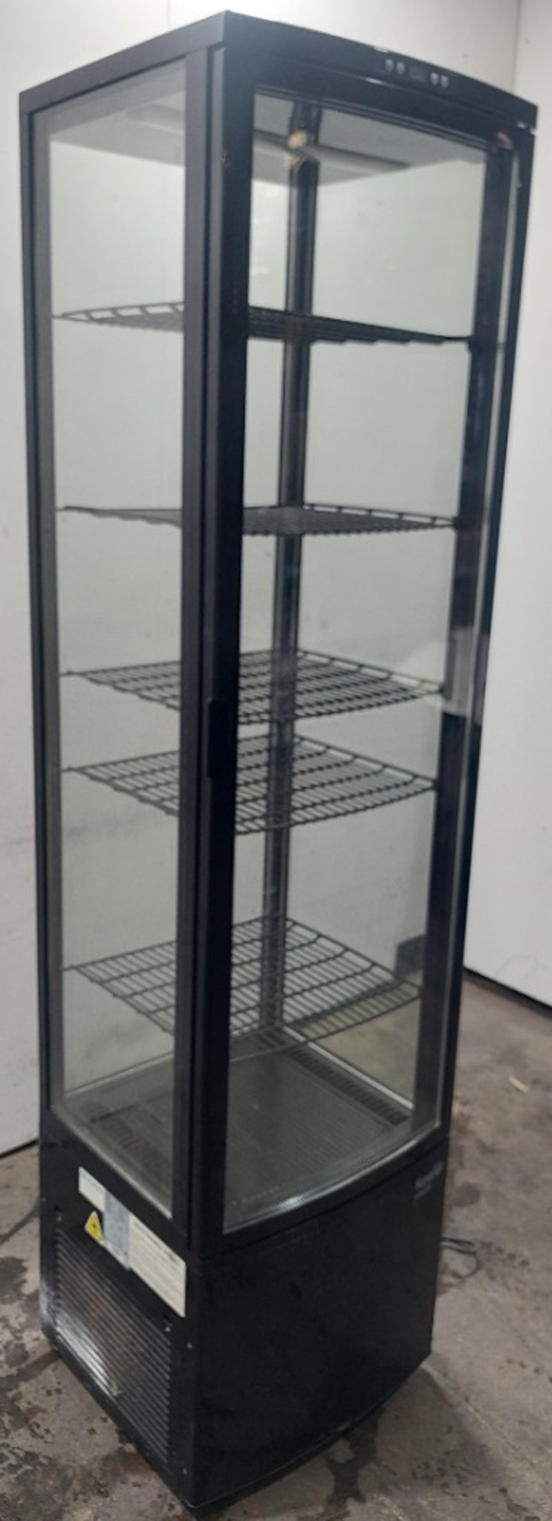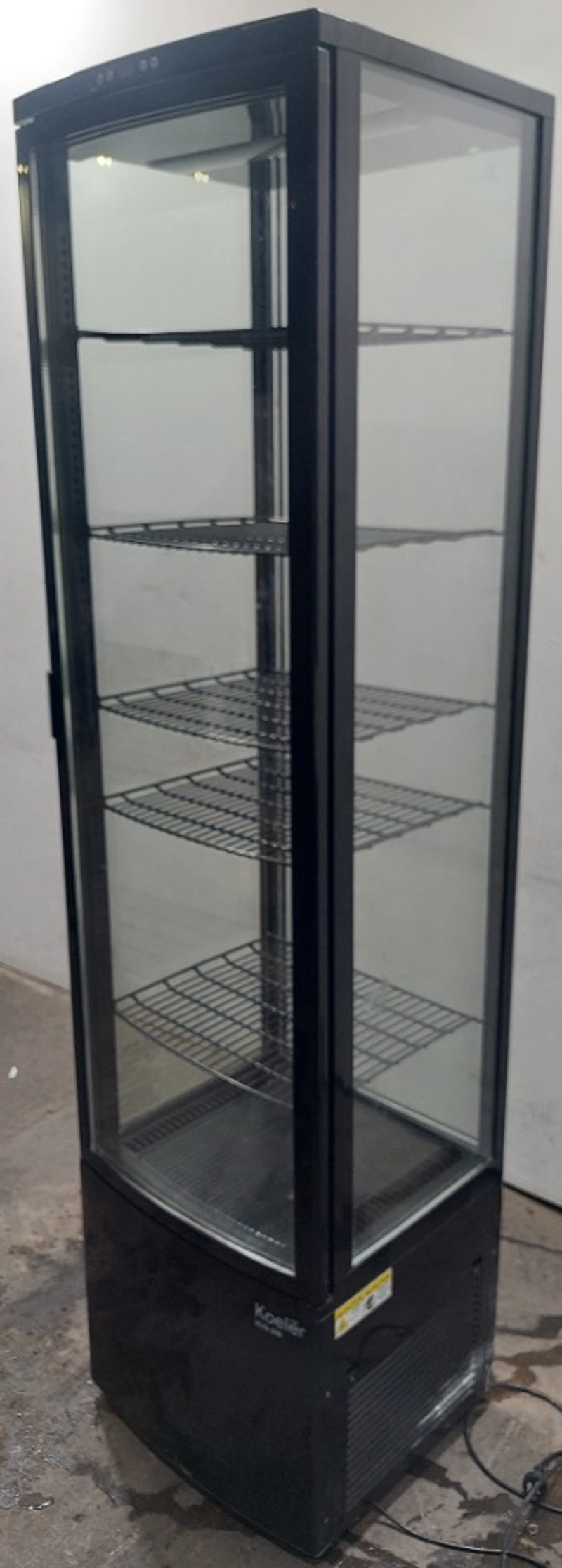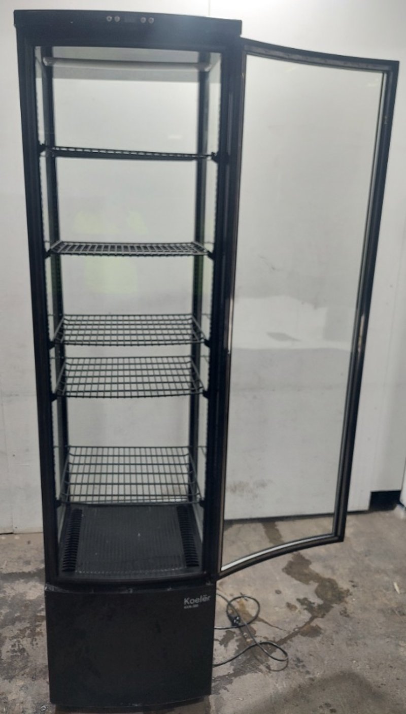 Koelër black commercial glass display coolerModel: KVN-300Dims:198cm H, 46cm W, 52cm LNote: item is untested, signs of wear.