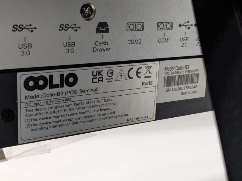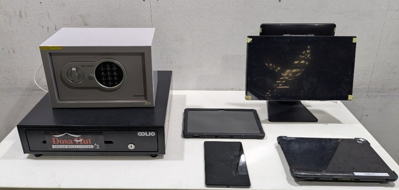 Assorted items including colio touchscreen monitor/terminal, M/N: Oolio-B3, S/N: UU20CT580542, touchscreen, M/N: T105, S/N: 150424168855 and more..
