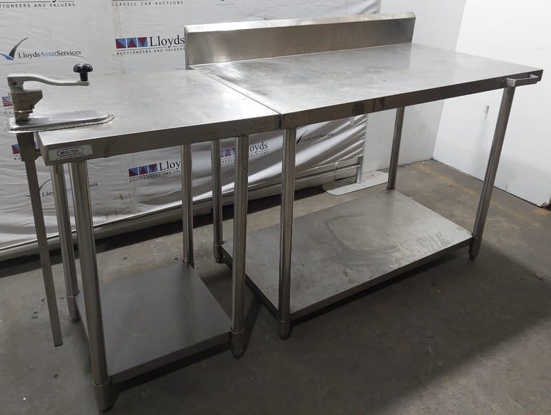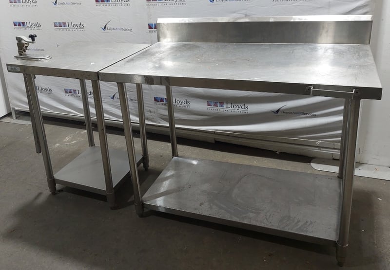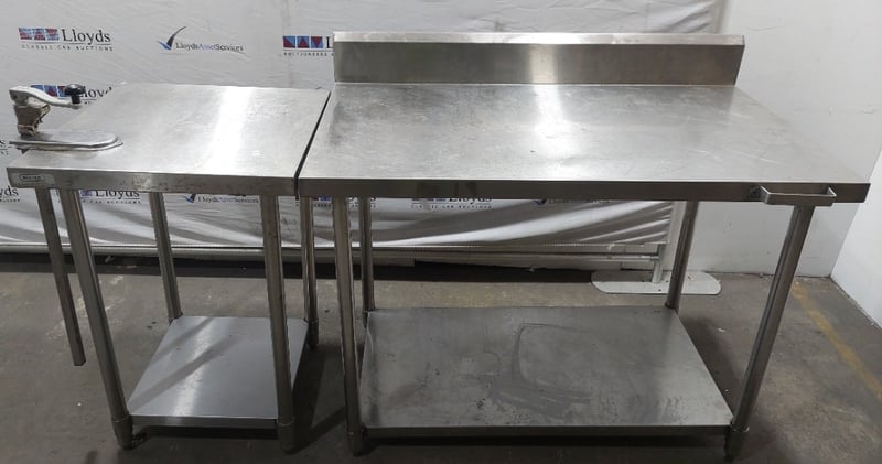 Large Table (Right): Stainless Steel Prep Bench with Splashback and Undershelf - Dimensions: 120cm L, 75cm W, 105cm H.
