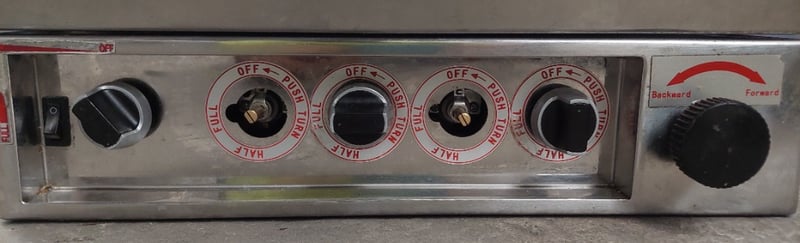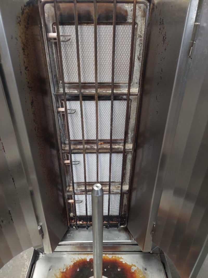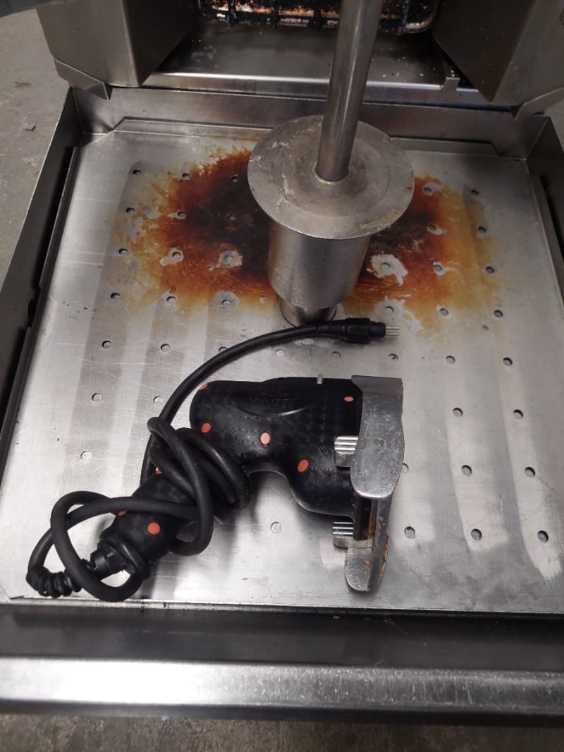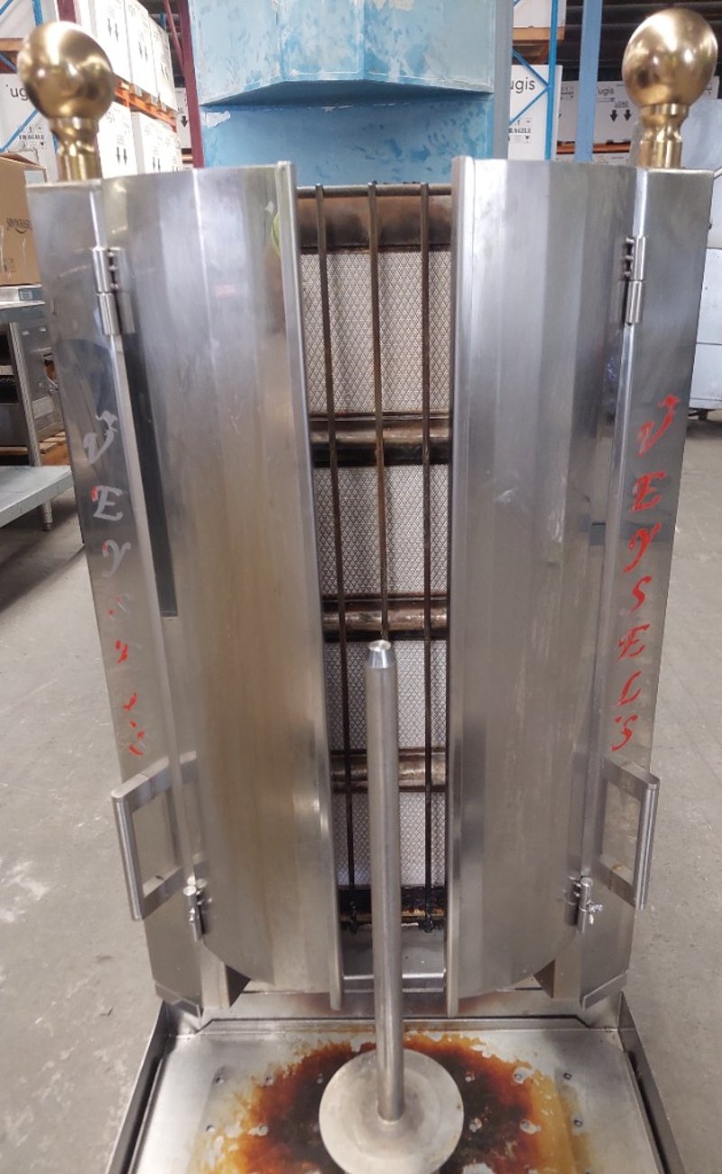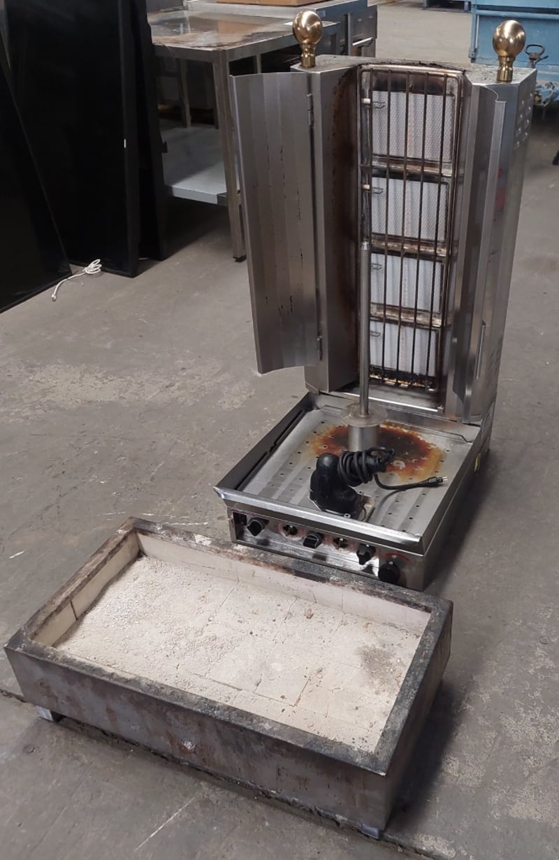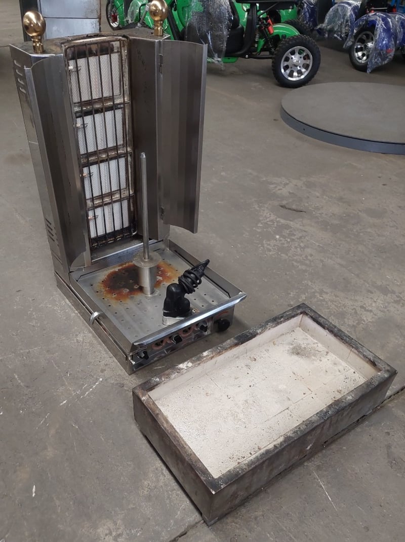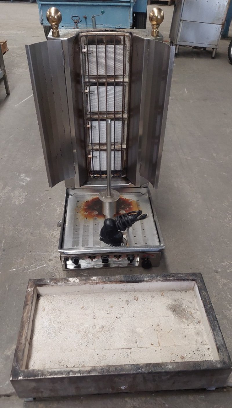 Rotisserie cooker featuring stainless steel construction with dual side-opening doors. Equipment includes rotating spit mechanism with mesh basket,Includes separate concrete catch tray for grease collection. Dimensions :105cm H, 50cm W, 70cm D. Note: untested,signs of wear
