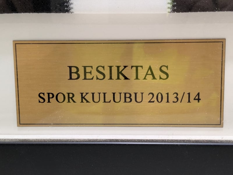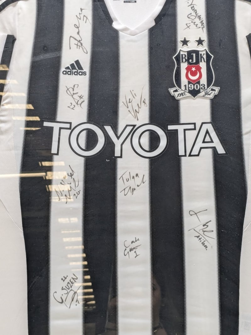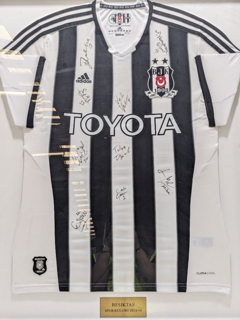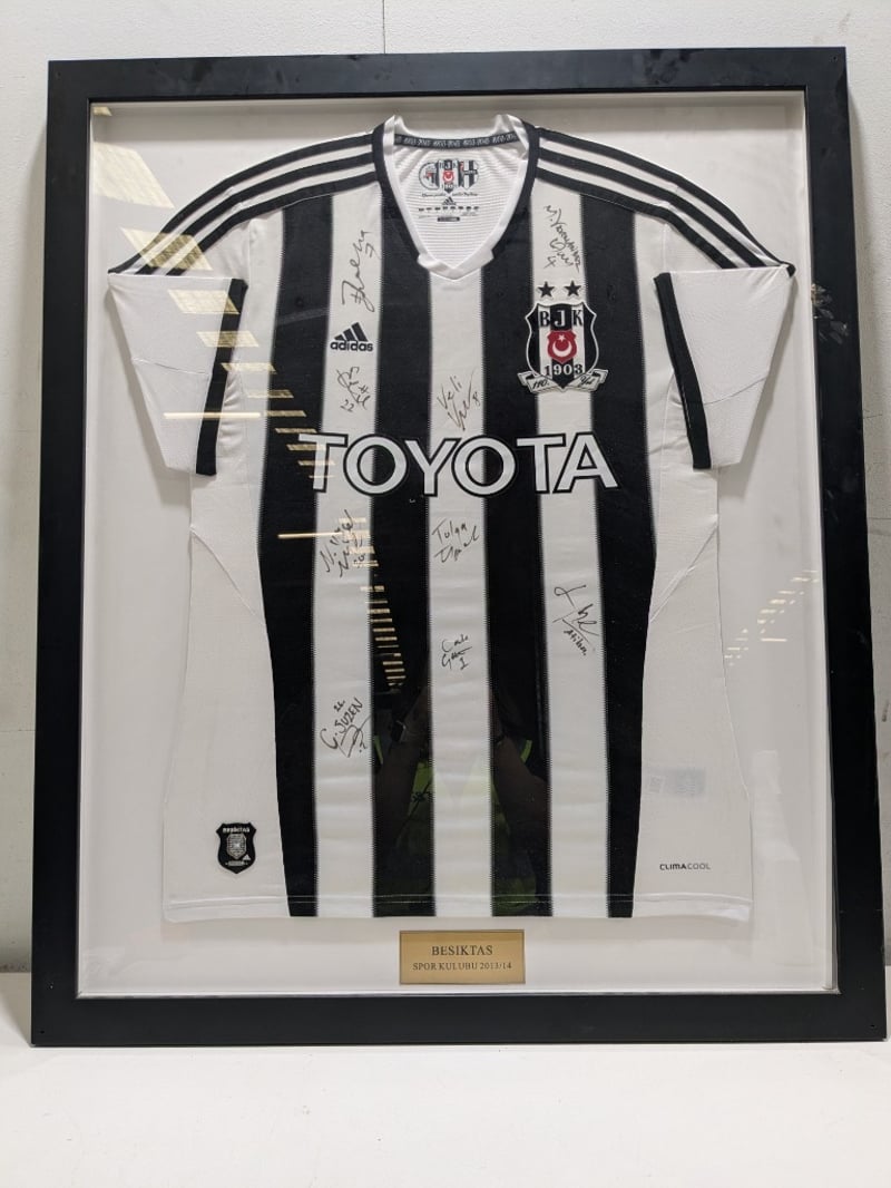 Besiktas Spor Kulübü 2013/14 season team-signed Adidas jersey, professionally framed in black wooden frame with UV-protective glass. White Climacool jersey featuring iconic black and white vertical stripes, Toyota sponsorship, and official Besiktas club crest (founded 1903). Fully autographed across the chest and sleeve areas by multiple squad members in black ink. Accompanied by gold nameplate reading "BESIKTAS SPOR KULÜBÜ 2013/14". Framing completed by Parris Art Custom Picture Framing, Parramatta NSW. Excellent provenance for Turkish football memorabilia collectors.