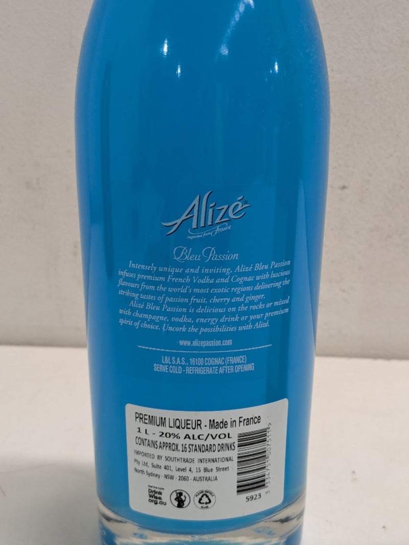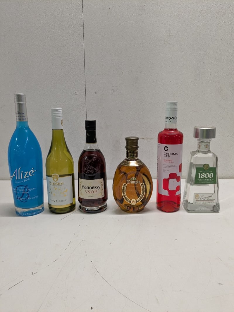 Alize Premium Liqueur Blue Passion1000ml, 20.0% Alc. Vol.Qty: 1 per lot.Giesen Pinot Gris750ml, 12.5% Alc VolQty: 1 per lot.Hennessy V.S.O.P Cognac700mL, 40.0% Alc. Vol.Qty: 1 per lot.Dimple 1893Whisky700mL, 40.0% Alc. Vol.Qty: 1 per lot.Chroma Lab Strawberry Liqueur 700mL, 20.0% Alc. Vol.Qty: 1 per lot.1800 Coconut Tequila700mL, 35.0% Alc. Vol.Qty: 1 per lot.Sold as a lot.