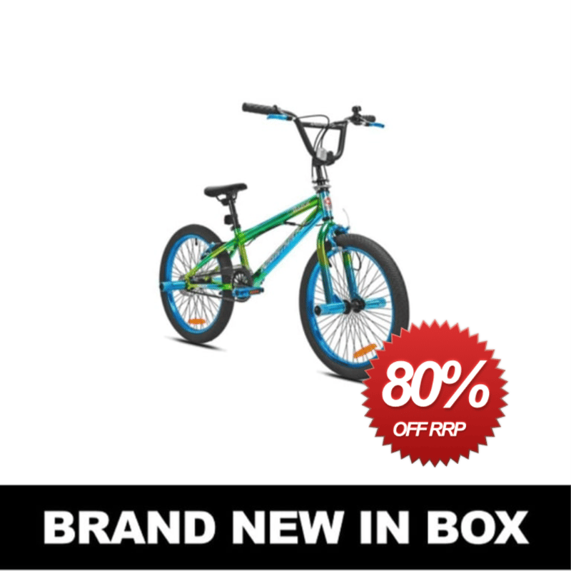 RRP $349 Razor 20" Nightmare Bike The Razor Nightmare BMX by is a feature packed freestyle bike that just so happens to have a drop-dead gorgeous paint job too! Sturdy steel frame and fork construction with wild paint over a silver undercoat. Matching high-rise BMX handlebars are held in place by a solid four-Bolt stem. Reach adjustable alloy handbrake levers control front side. Pull calliper alloy brakes and rear linear pull alloy brakes. Cable detanglers keep brakes working and prevents twisted cables while performing all the latest freestyle manoeuvres. Front and rear pegs are included for all your grinding and standing needs. Specifications Frame material: sturdy steel Fork material: steel Gearing (# of speeds): single speed Kent BMX bike brakes: front caliper alloy handbrakes Wheels/tyres: 20" BMX Handlebars: BMX design with a four-bolt stem Seat: BMX Pedals: lightweight plastic Kickstand Insulated Assembly: adult assembly required Detanglers prevent cables from twisting during 14 tricks #e2mob