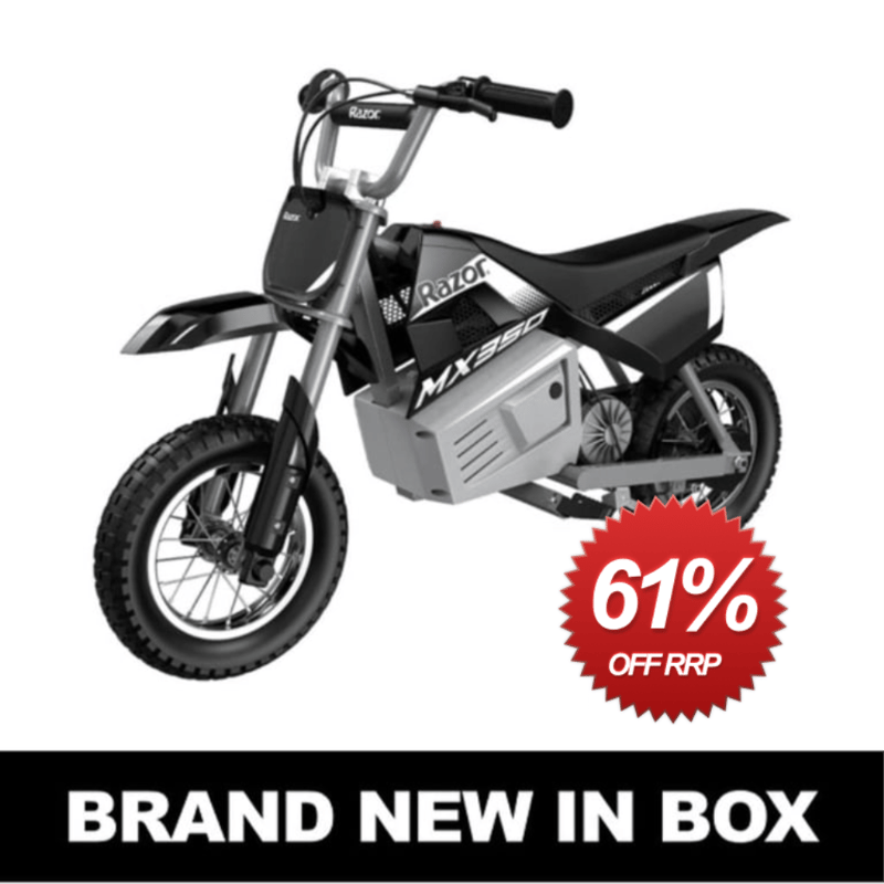 RRP $899 Razor Dirt Rocket MX350 - Black Eat Dirt Hills For Breakfast The Dirt Rocket™ MX350 is a scaled-down, electric-powered dirt bike that lets younger riders live out their off-road fantasies. At speeds up to 22KM/H, it leaves similar pocket dirt bikes in the dust.