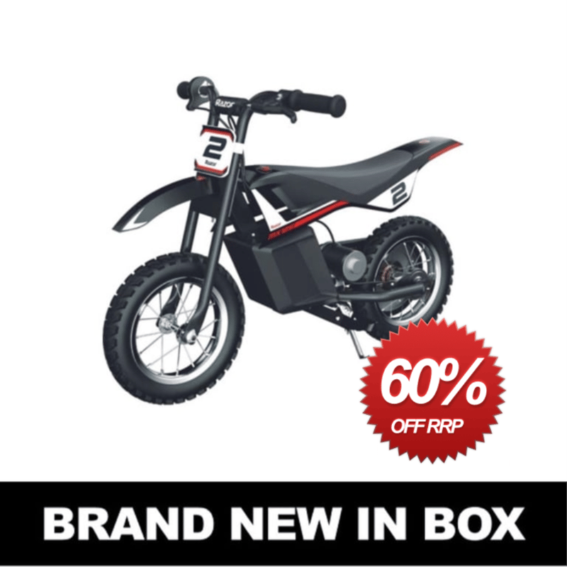 RRP $499 Razor Dirt Rocket MX125 Dirt Bike The MX125 is Razor’s smallest electric dirt bike, scaled down to size for riders ages 7 and up Designed with motocross dirt bike geometry, knobby tires and twist-grip throttle Rear-wheel drive delivers better balance control and traction for a safer, more stable ride Carries riders at speeds of up 13 km/h with up to 40 minutes of continuous use Features a crossbar reinforced handlebar, spoked wheels with 12” pneumatic, knobby tyres, retractable kickstand, and hand-operated rear brake Includes a 12V sealed lead-acid rechargeable battery