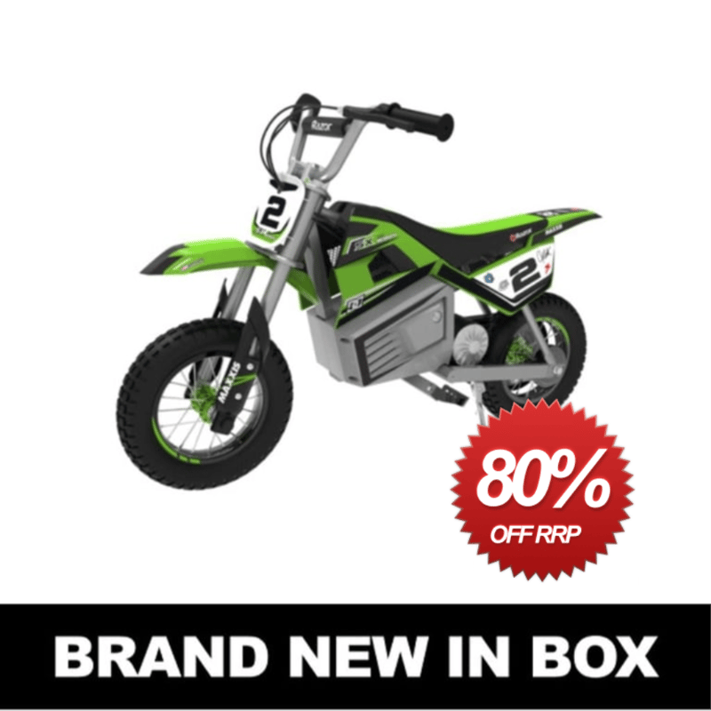 RRP $899 Razor SX350 McGrath Electric Dirt BikeRide Like a ChampInspire your child to ride with confidence and excitement on this authentic, motocross-style dirt bike, proudly endorsed by legendary supercross champion Jeremy McGrath.Built for Beginner SuccessDesigned with younger riders in mind, the SX350 offers a twist-grip throttle and a hand-controlled rear brake, delivering a smooth, safe ride on dirt, grass, or gravel.Small Size, Big AdventureScaled down for kids but packed with power, this rugged electric bike features a steel frame, 12-inch pneumatic knobby tires, adjustable handlebars, and a high-torque motor, perfect for little thrill-seekers ready to ride like the pros.FeaturesSupercross champ inspired with authentic Jeremy McGrath graphics and fairing designDual speed settings let riders choose between low (up to 10 mph) and high (up to 14 mph) modes12" pneumatic knobby tires provide traction and control on uneven terrainRide time up to 60 minutes in low mode or 30 minutes in high mode on a full chargeMX-style steel frame with chain-driven motor, twist-grip throttle, rear hand brake, folding metal foot pegs, and retractable kickstand#e2mob