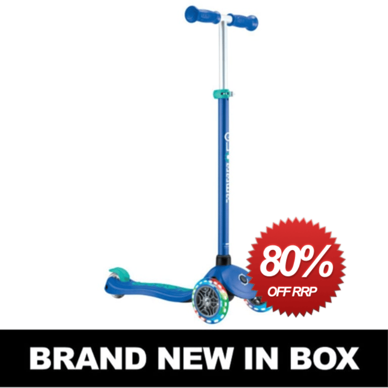 RRP $149 Globber PRIMO Plus Lights Kids Scooter - Navy Blue Globber Primo Plus Lights 3-Wheels Scooter Globber is an award-winning brand, recognised for its innovative designs and unmatched functionality across its toddler scooters with seats, balance bikes & tricycles, kids/adults scooters, and stunt electric scooters for all ages. Made with 26-29% recycled plastic, you can start your scoot-ventures today! EASY-TO-LEARN SCOOTING | Patented steering lock button fixes the steering system of the two front wheels to only move forward & backward, helping your child learn to balance. Unlock the button to enable lean-to-steer riding. ADJUSTABLE KIDS SCOOTER | Adjustable scooter comes with a 4-height adjustable aluminium painted T-bar with easy to use clamp and TPR handlebar grips for kids aged 3-9+. LIGHT-UP SCOOTER WHEELS| Comes with battery-free 121mm LED light-up front scooter wheels that flash red, green, and blue. Thanks to dynamo technology integrated into the front scooter wheels’ core, the faster you scoot, the brighter the LEDs appear! Also included is one 80mm rear PU casted wheel, mounted on ABEC 5 bearings. ROBUST SCOOTER | Super low dual-colour composite deck with a reinforced structure., anti-slip deck, and grip tape, which supports up to 50kg. Extra long and wide composite rear brake delivers brake efficiency and prolongs wheel longevity. T-Bar Height from Ground: 67.5 / 72.5 / 77.5 / 82.5 cm #e2mob