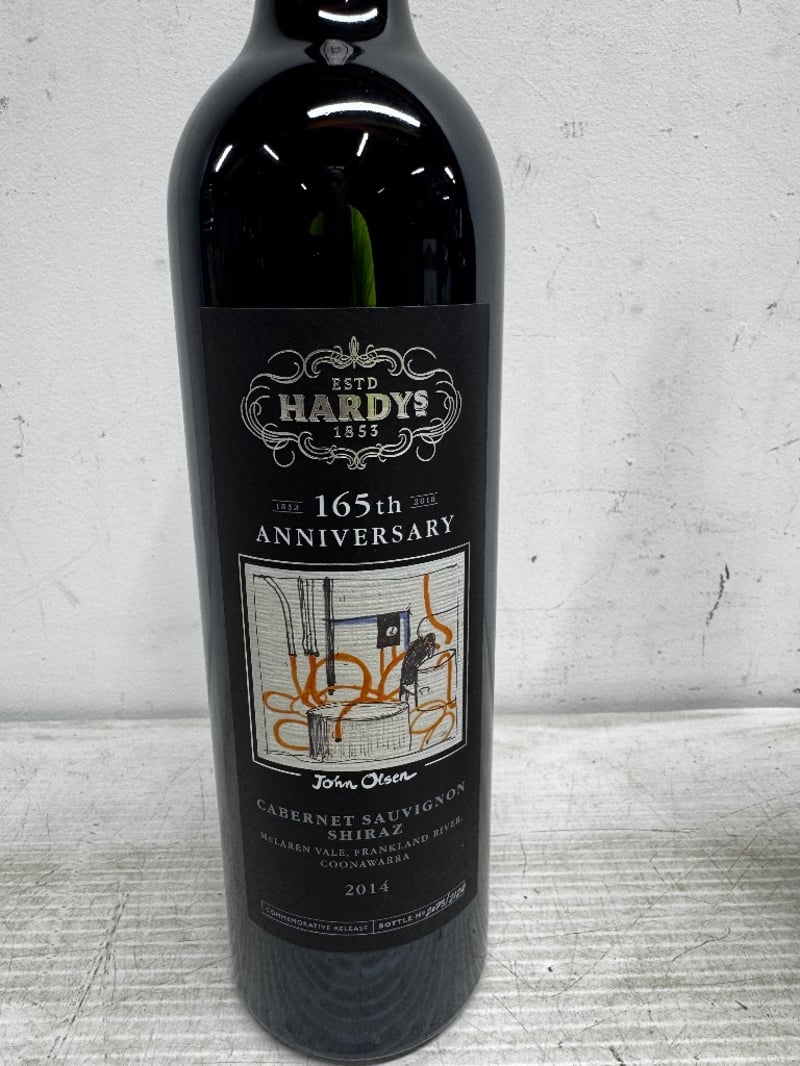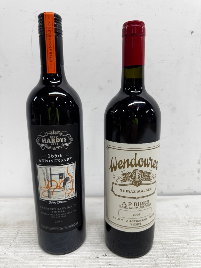 Wine, 1x bottle of 2014 Hardys 165th anniversary Cabernet Sauvignon Shiraz 750mL and 1x bottle of 2006 Wendouree Shiraz Malbec, 750mL