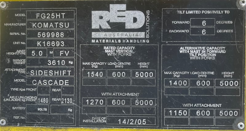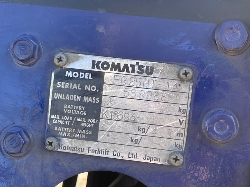 RRP $8,945 2014 Komatsu Forklift Make: Komatsu Model: CASCADE Year: 2014 Serial Number: 569988 Engine: unsighted Hours: 12157 Transmission: automatic Capacity: 1540kg Mast Height: 4.3m Max Tyres: solid Tynes: 1m Approx Weight: 3610kg Description / Extras: Starts and runs Key # RA13