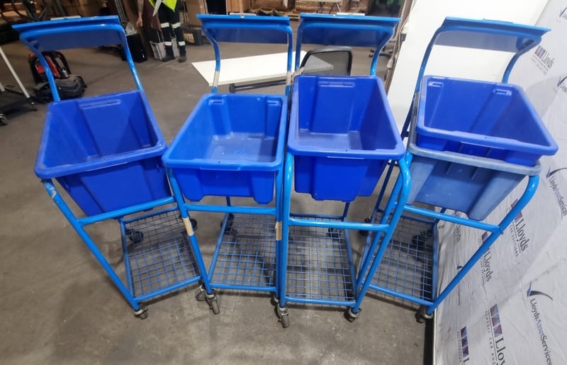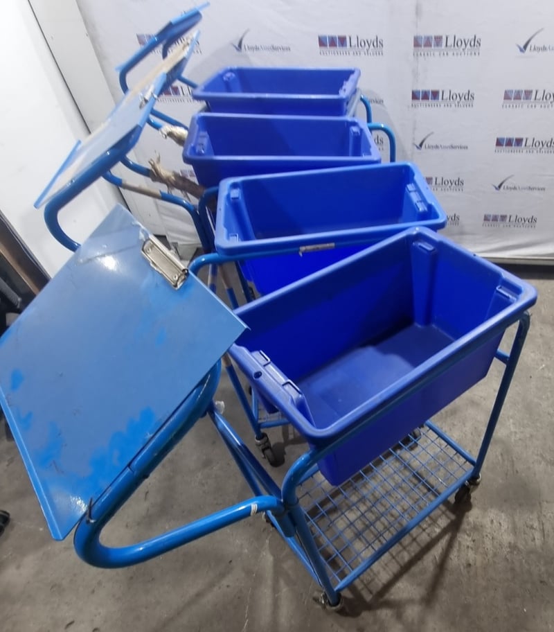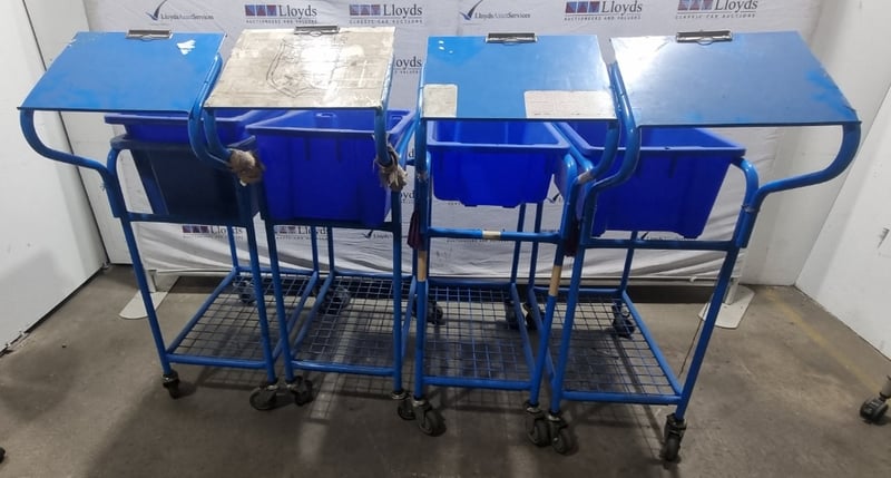 RRP $1,572.50 Industrial Pick/Pack trolleys, blue, mobile castors. Sold as lot Note: signs of wear