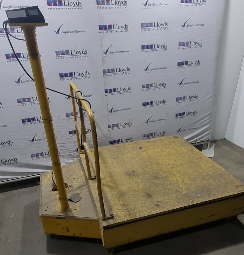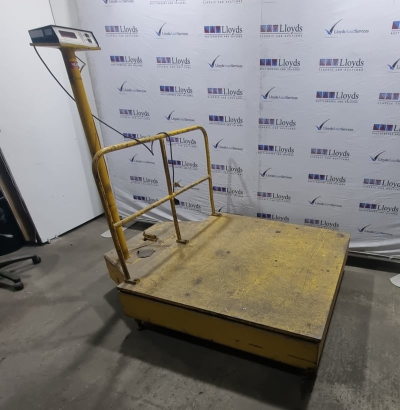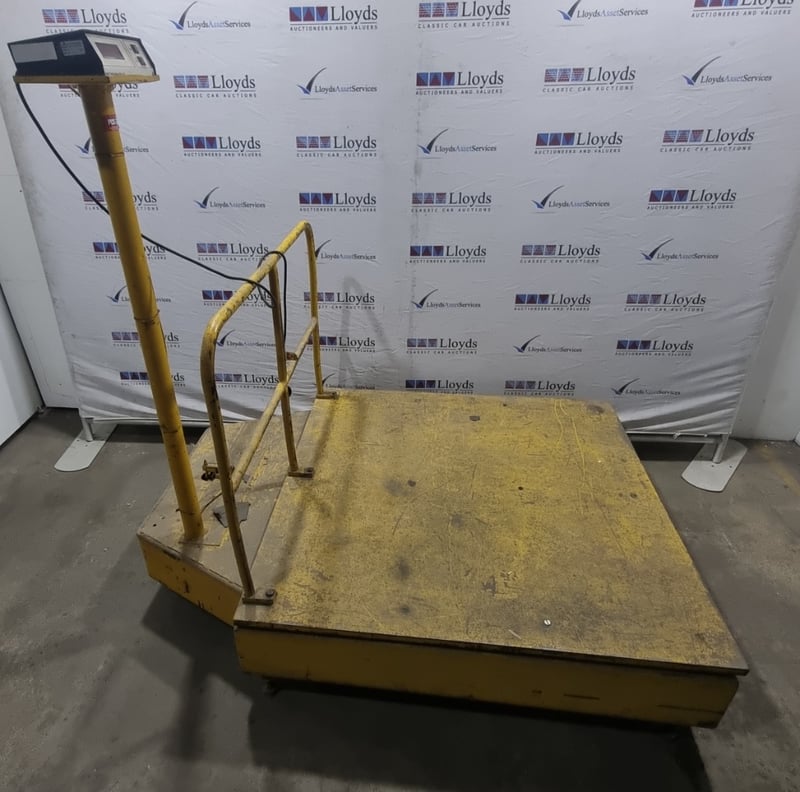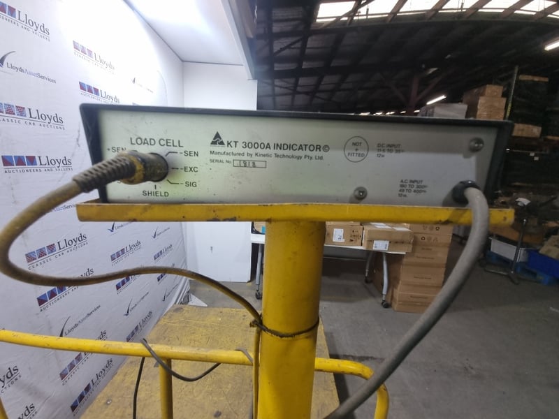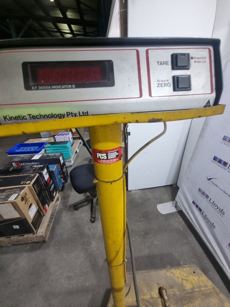 Industrial platform scale manufactured by Kinetic Technology Pty Ltd, model KT 3000A Indicator. Yellow powder-coated steel construction. Note: untested,signs of wear