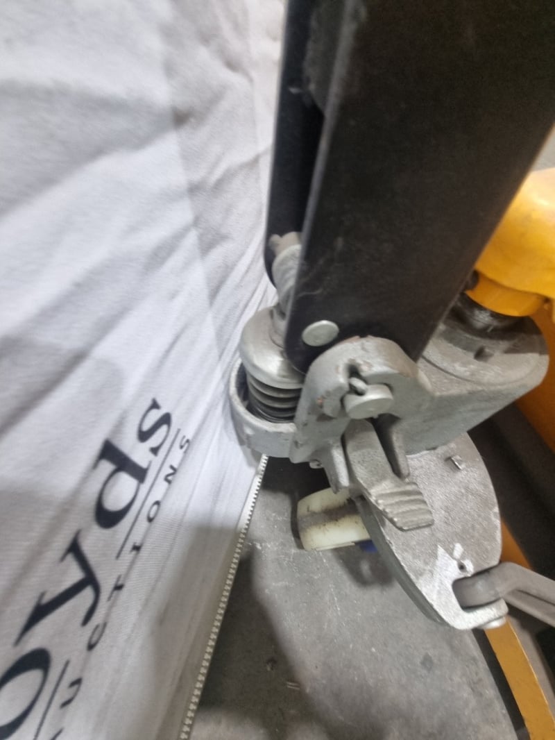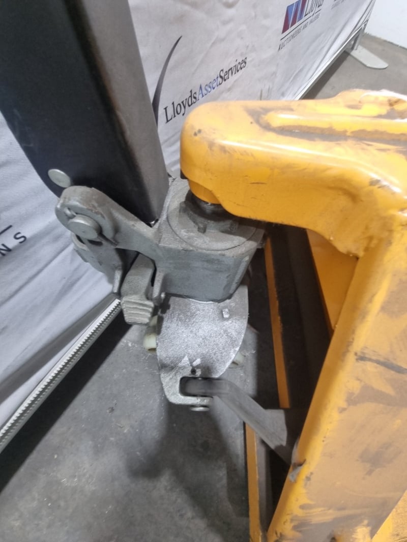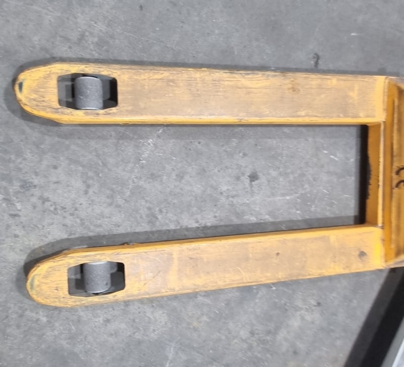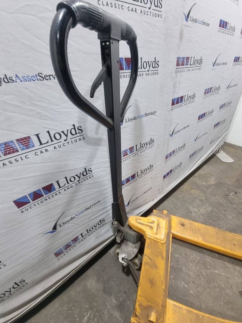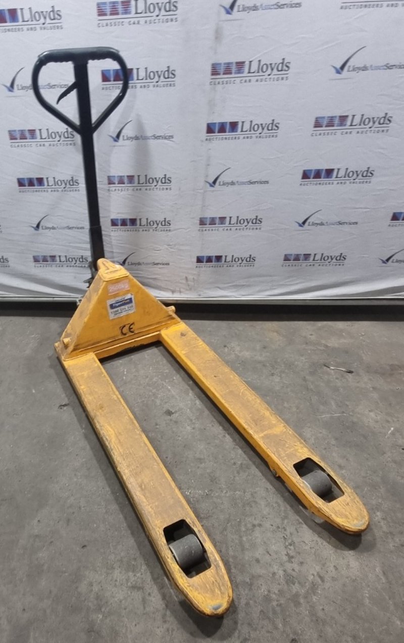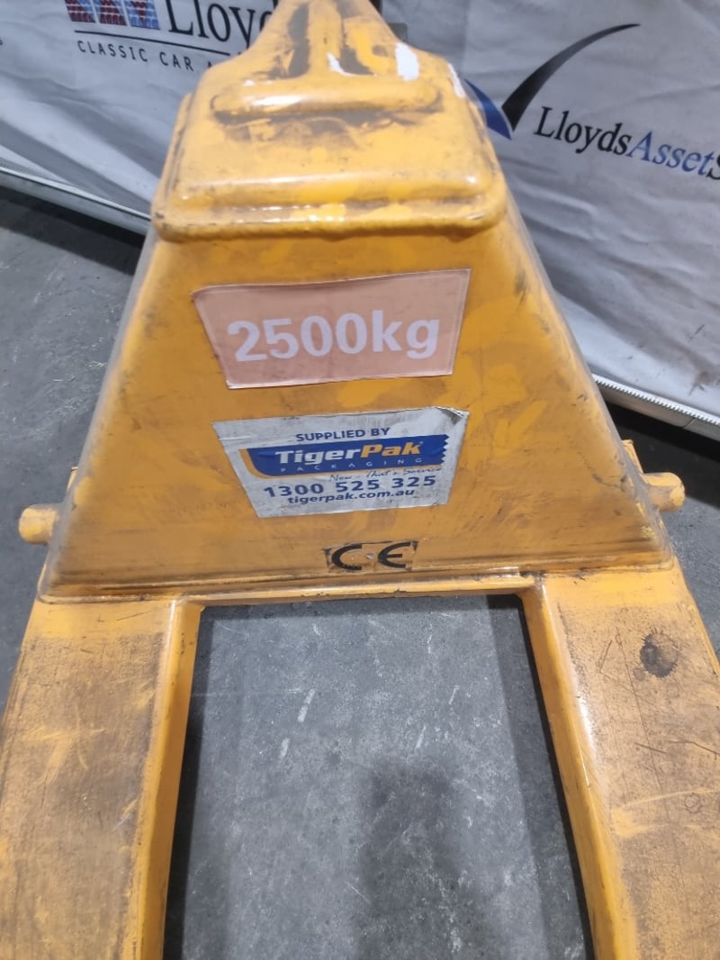 RRP $58 TigerPak manual pallet jack with 2500kg capacity. Yellow and black industrial lifting equipment. Note: signs of wear