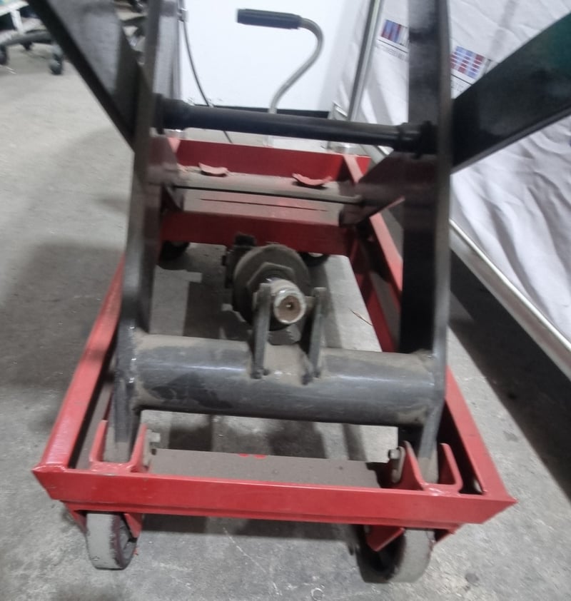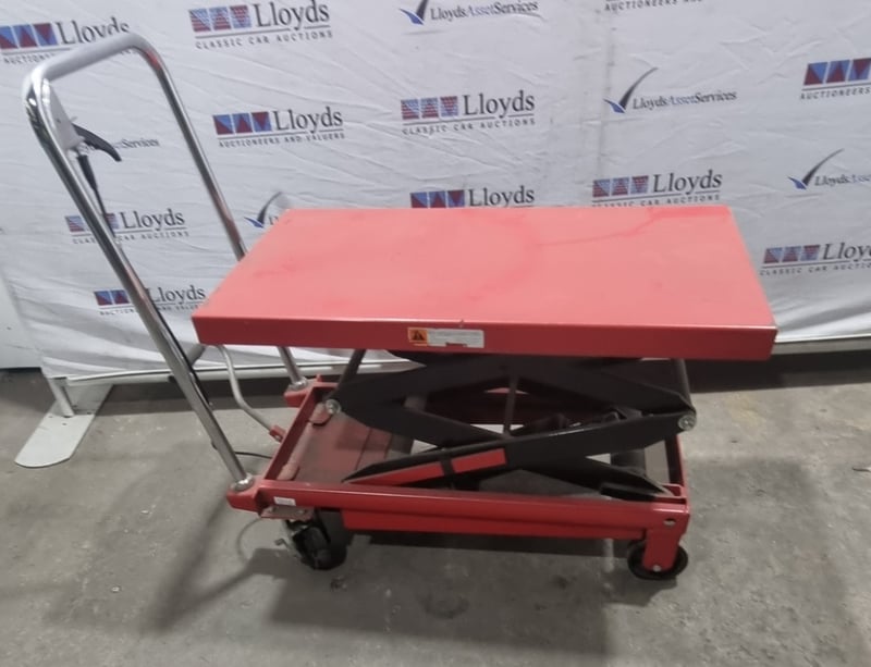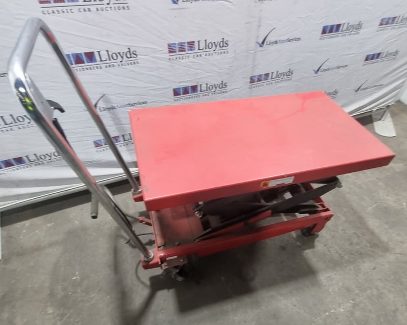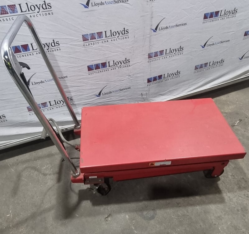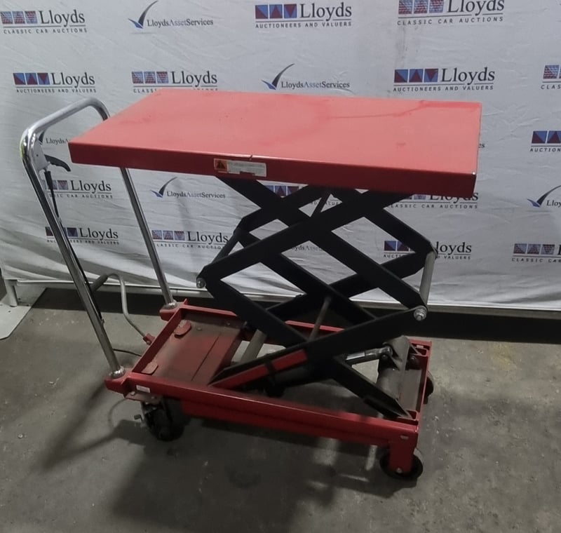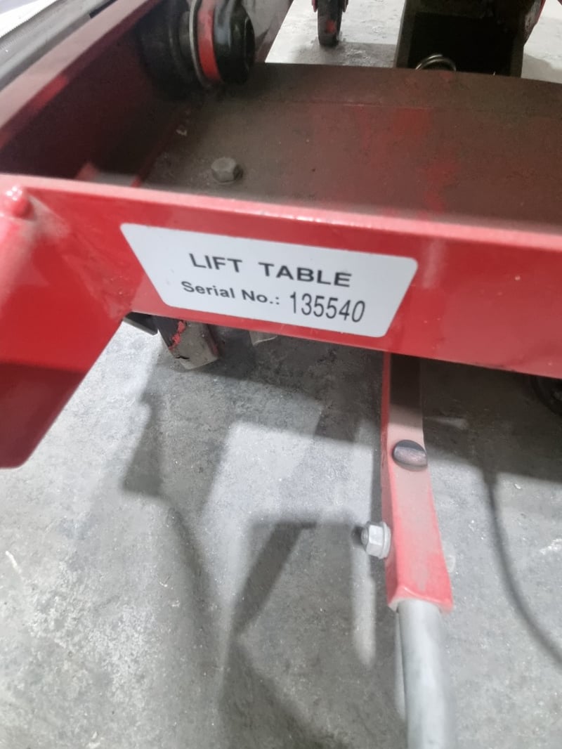 Red hydraulic lift table with manual hand pump operation. Serial No. 135540.