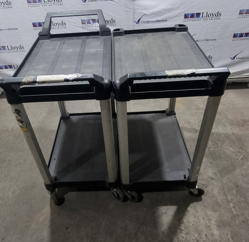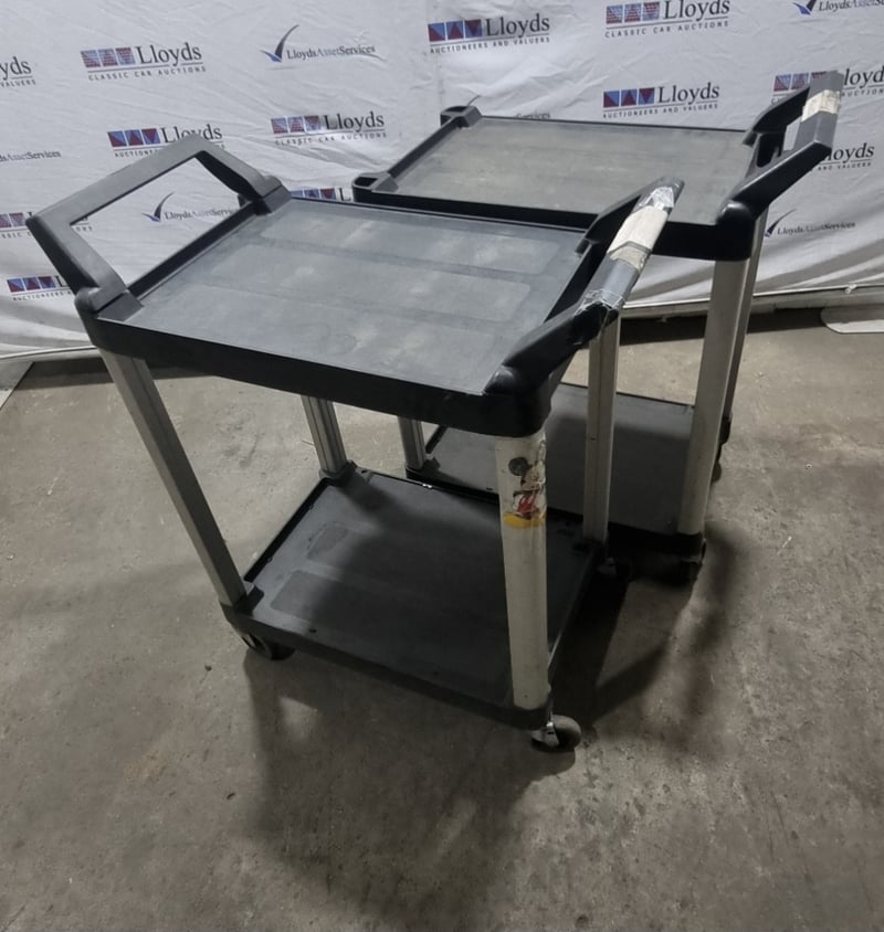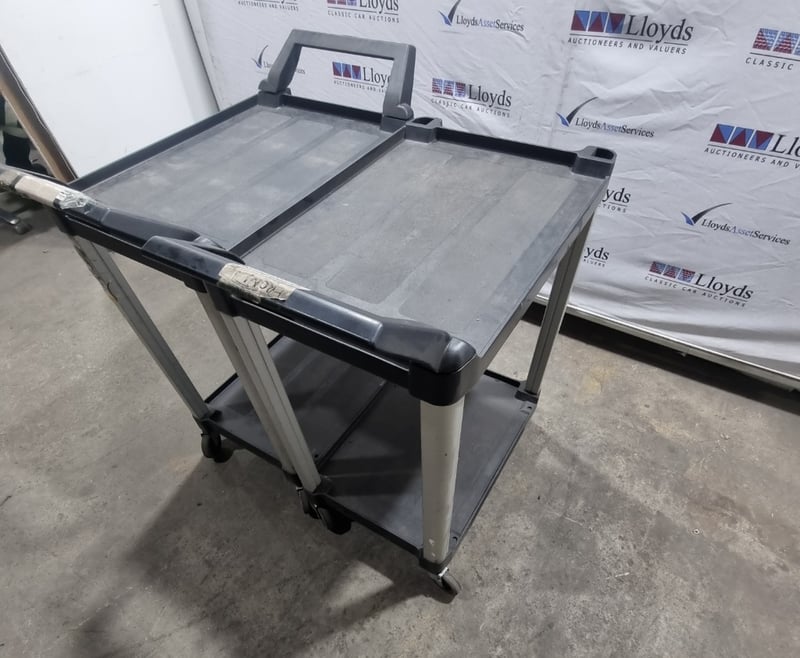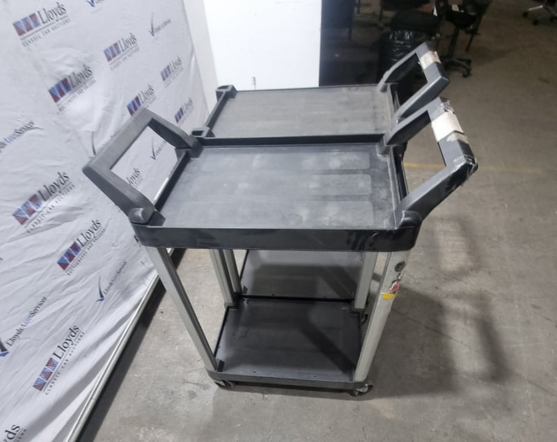 Three-tier utility service cart featuring durable plastic construction, mobile castors. Sold as lot