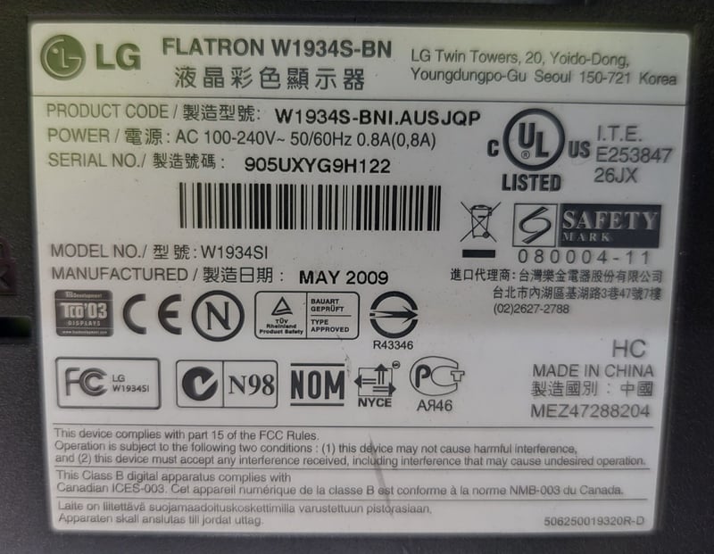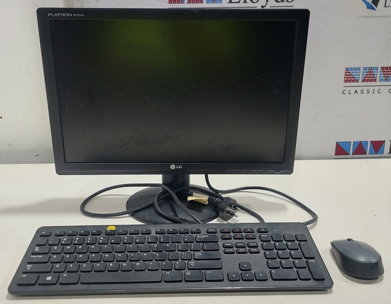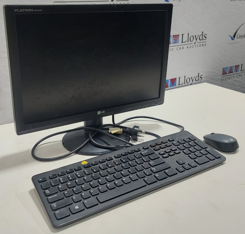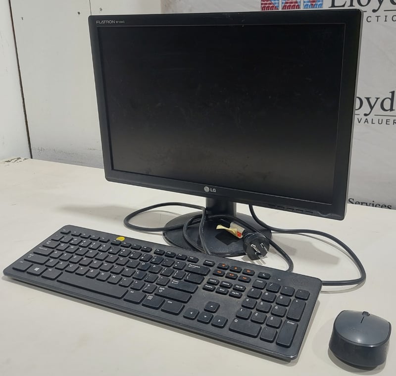 Office equipment lot includes, LCD Monitor LG brand, Serial no: 905UXYG9H122, Keyboard Dell brand, mouse Logitech brand and power cables.Sold as lot.Notes: items untested and signs of wear.
