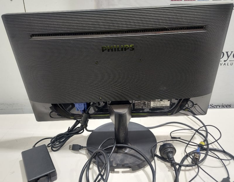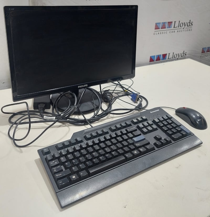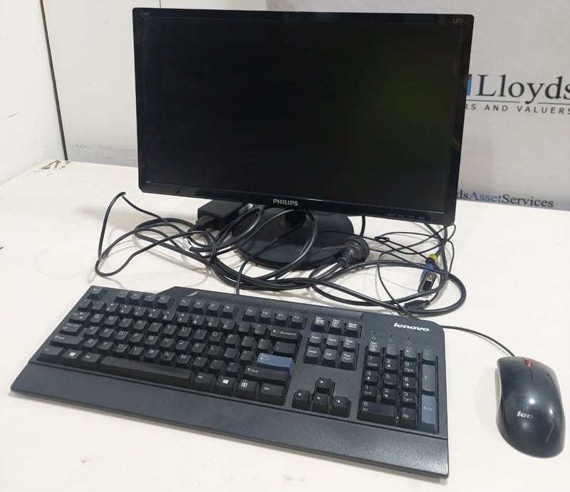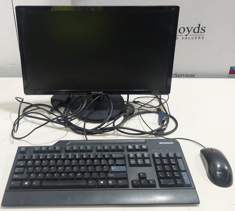 Office equipment lot includes, LCD Monitor Phillips brand, Serial no: ZV0A1703001520, Keyboard Lenovo brand, mouse Lenovo brand and power cables.Sold as lot.Notes: items untested and signs of wear.