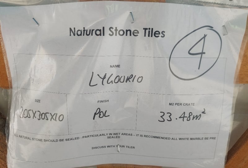 Natural Stone Tiles Lygourio Dimensions: 305x305x10 Polished finish 33.48m squared per pallet. Bid per pallet.