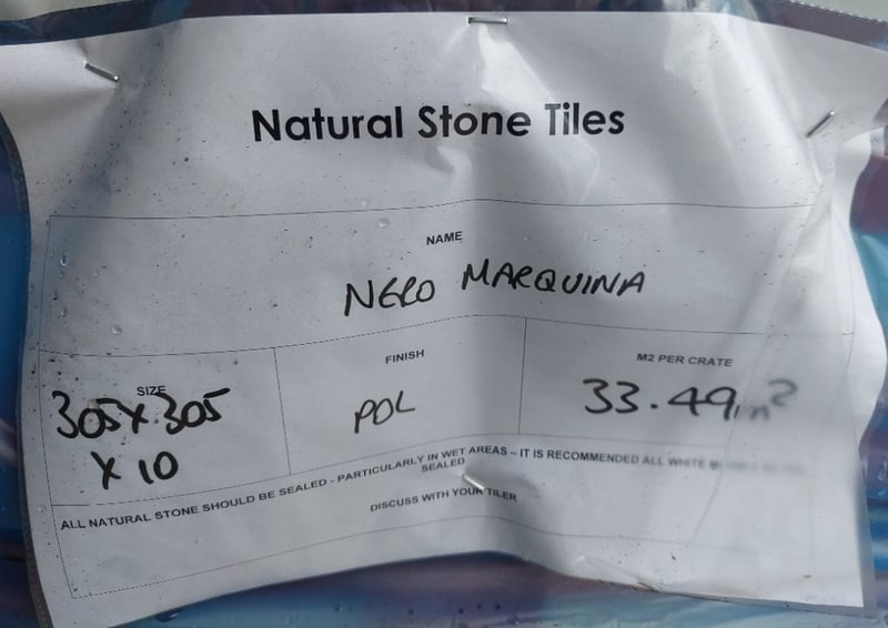 Natural Stone Tiles. Nero Marquina Dimensions: 305x305x10 Polished Finish 33.49m squared per crate Bid per pallet.