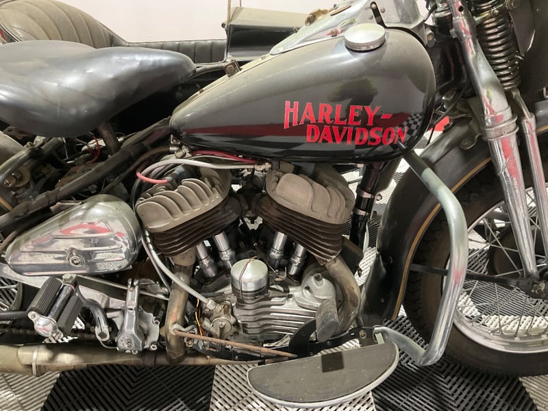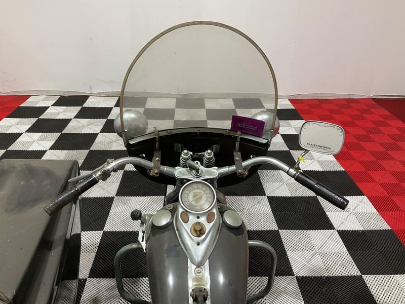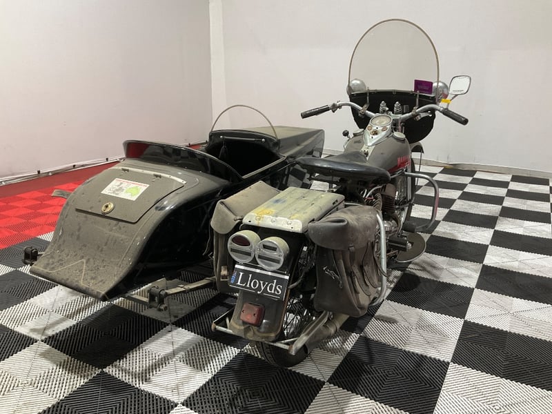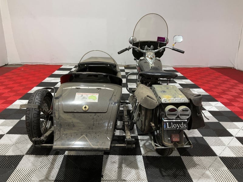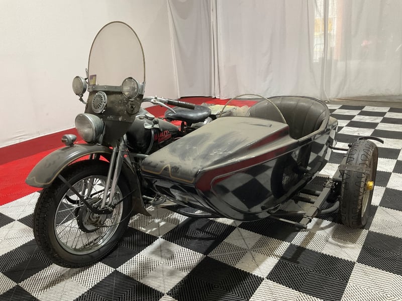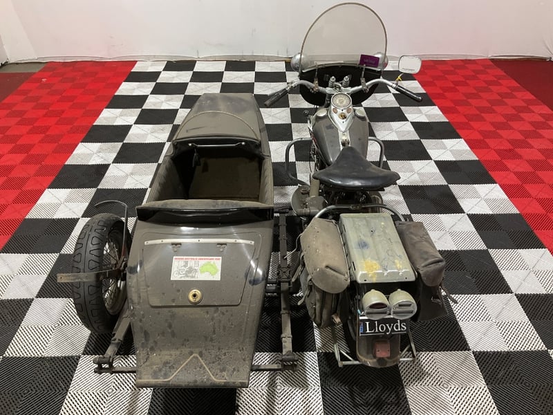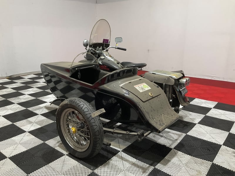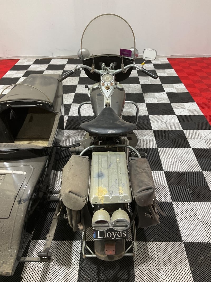 Description: Barn find Harley Davidsonwith side car, V twin engine, leather side saddles, kick start, flat head, new tyres