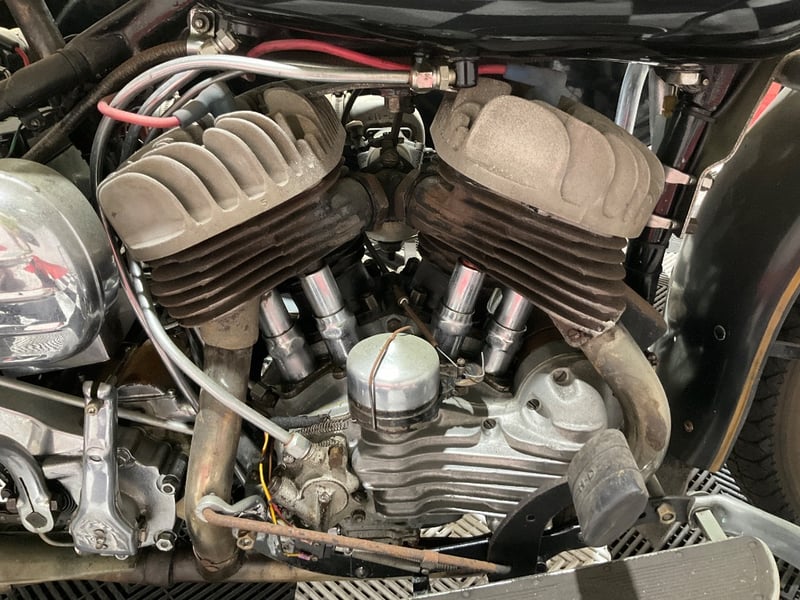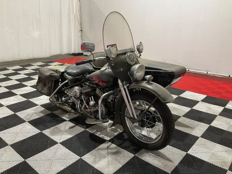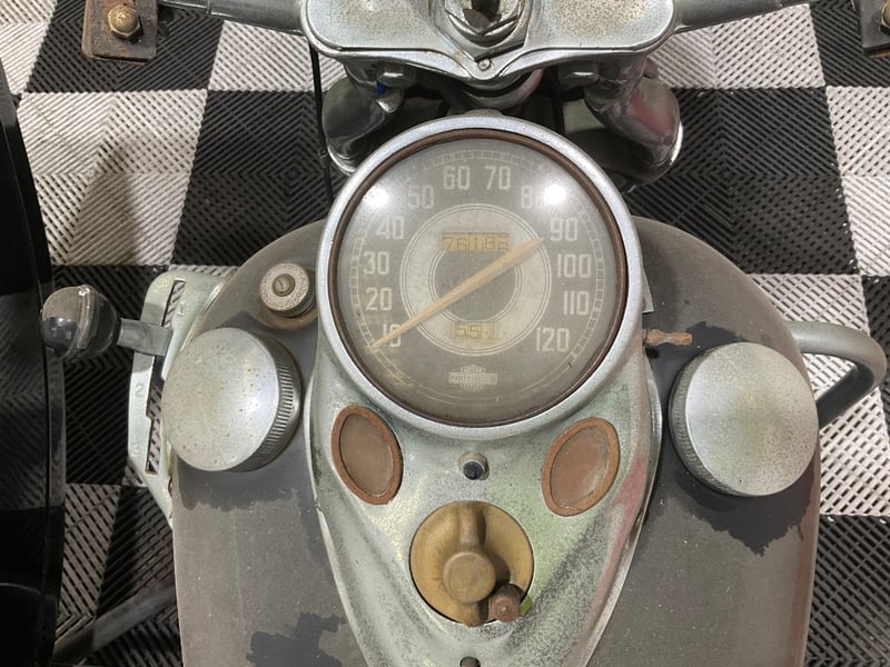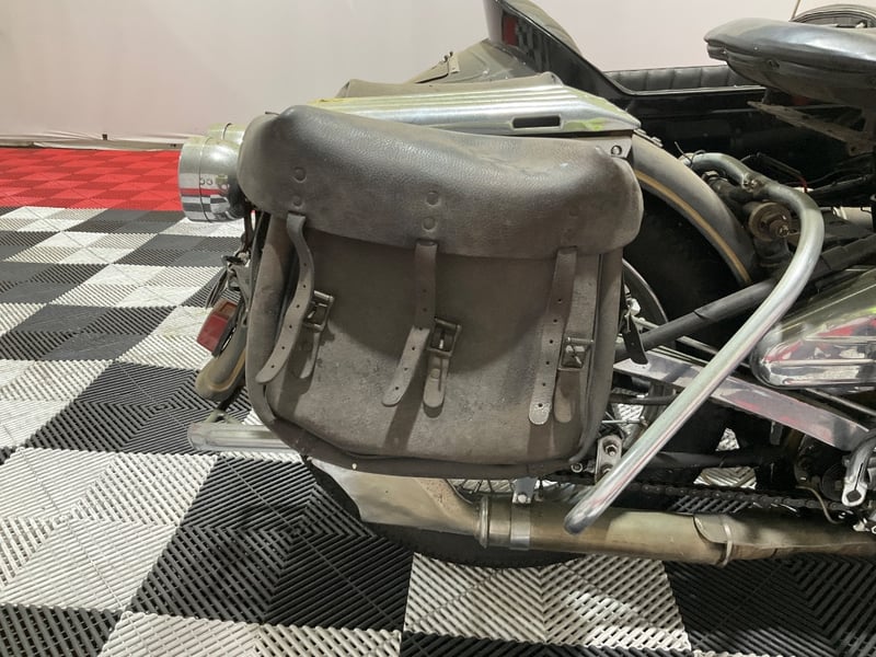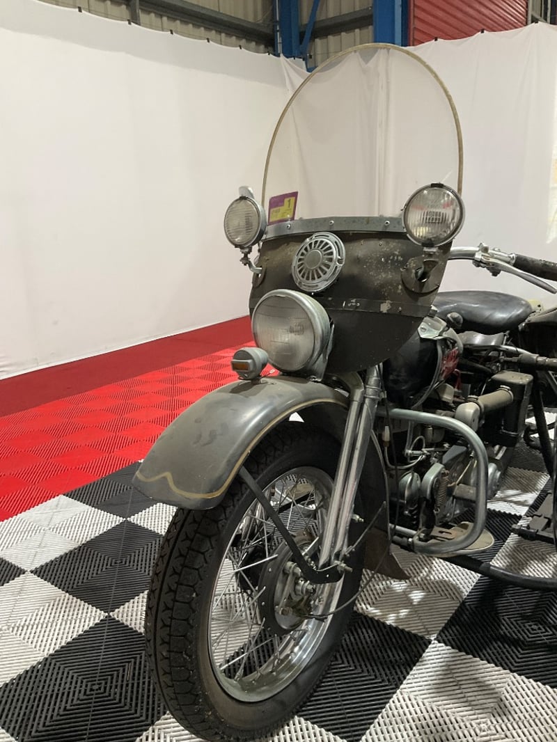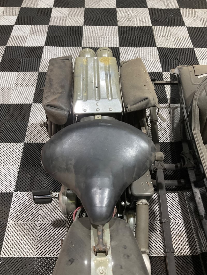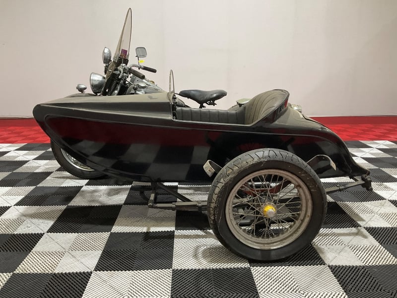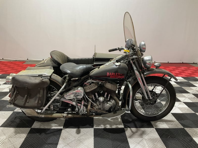 Description: Barn find Harley Davidsonwith side car, V twin engine, leather side saddles, kick start, flat head, new tyres