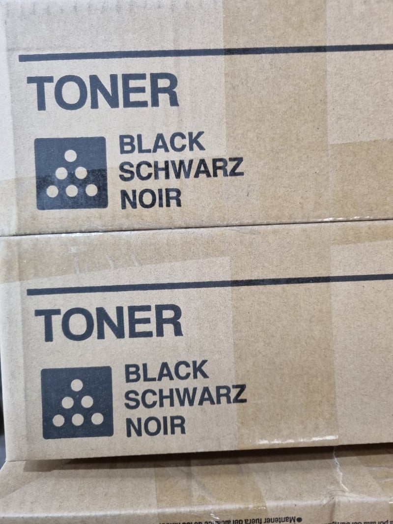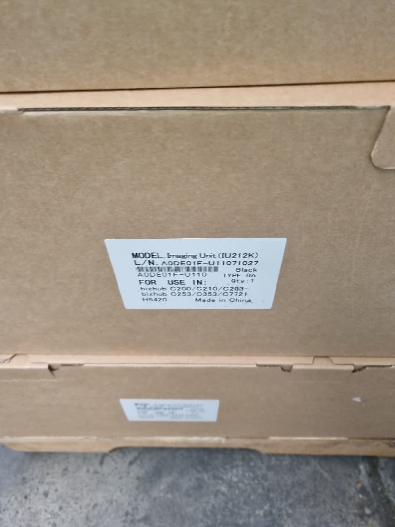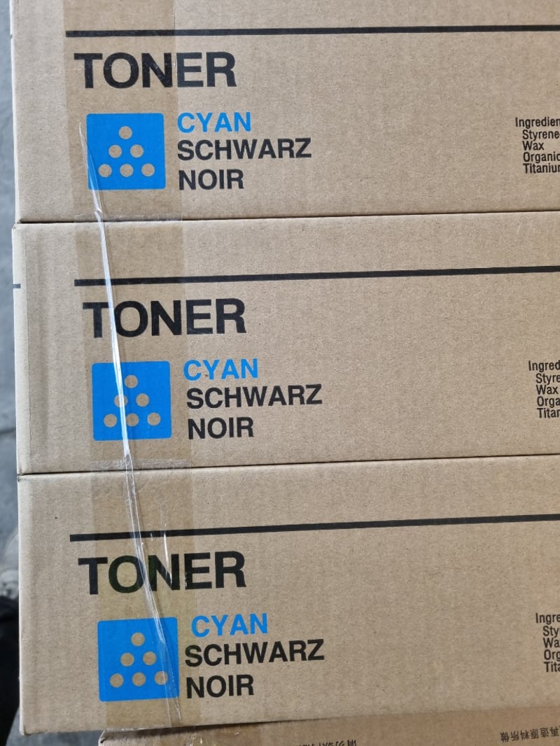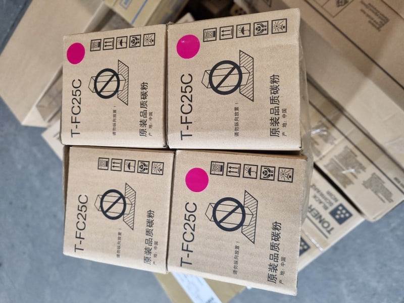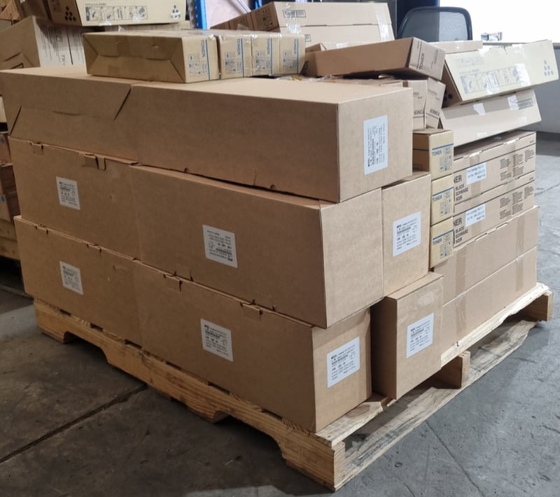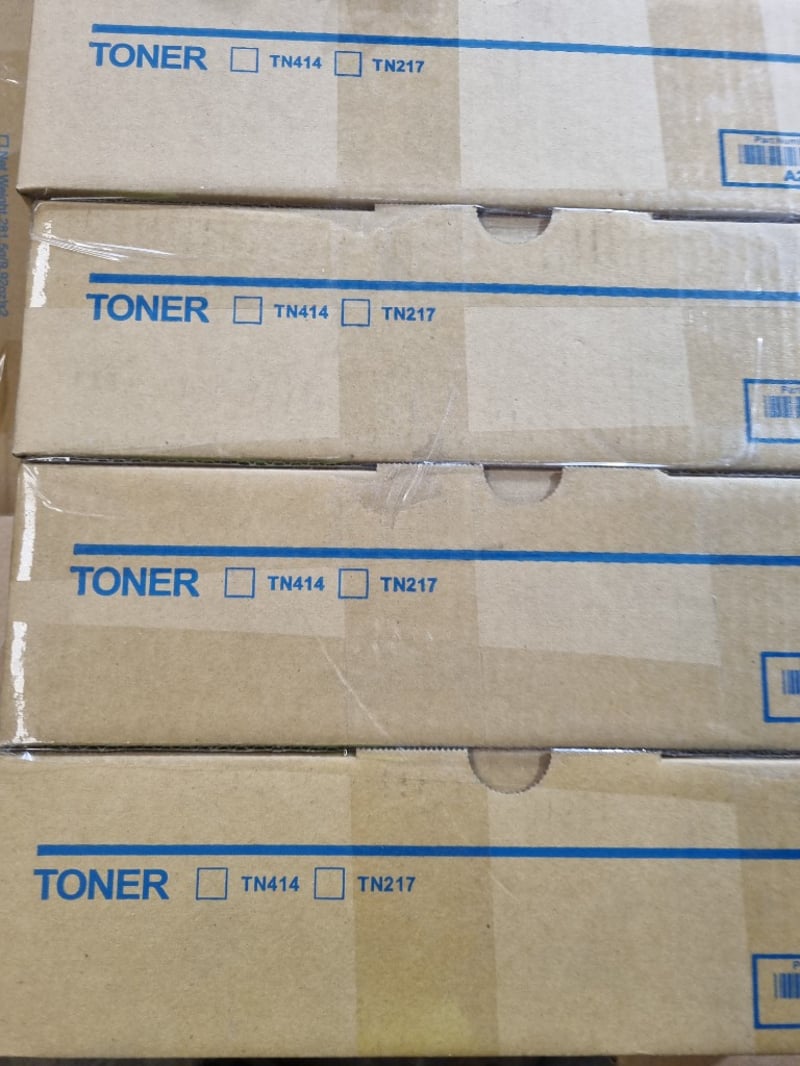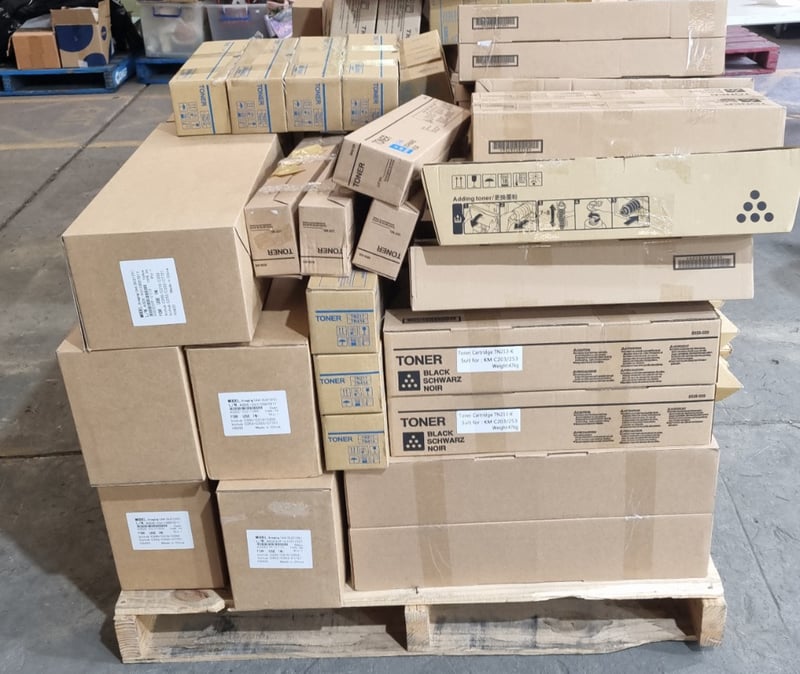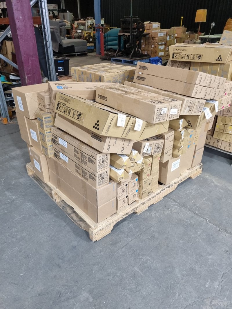 Wholesale lot of printer consumables and replacement parts. Contents include multiple toner cartridges in black and cyan variants (TN414, TN217 compatible), imaging units (IU212K model), and miscellaneous office equipment components. Stock comprises approximately 30+ sealed boxes on wooden pallets, containing both genuine and compatible supplies for commercial copier/printer systems.
