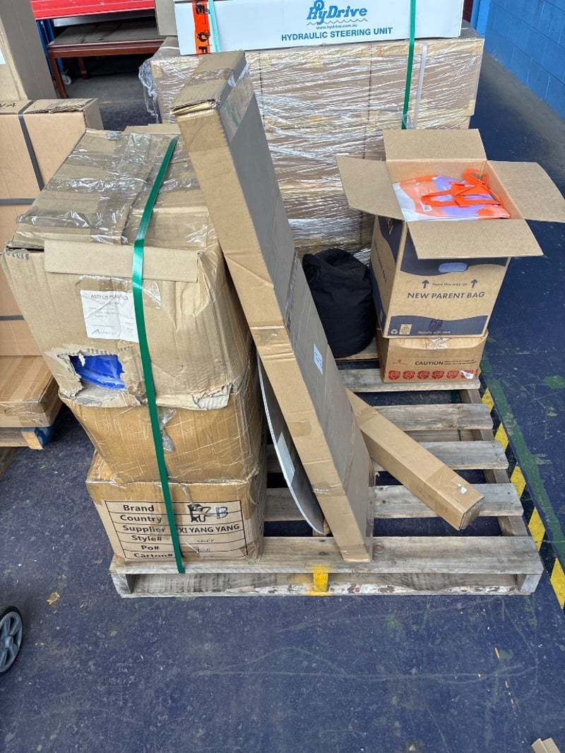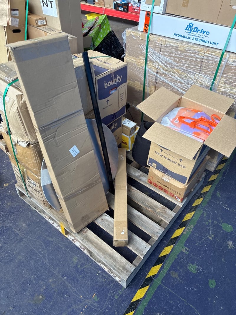 Pallet lot, Includes Various Carry Bags, Car Parts, Storage Containers & More.