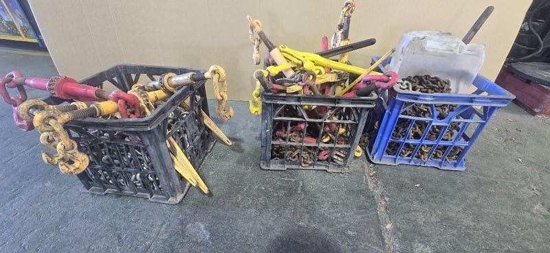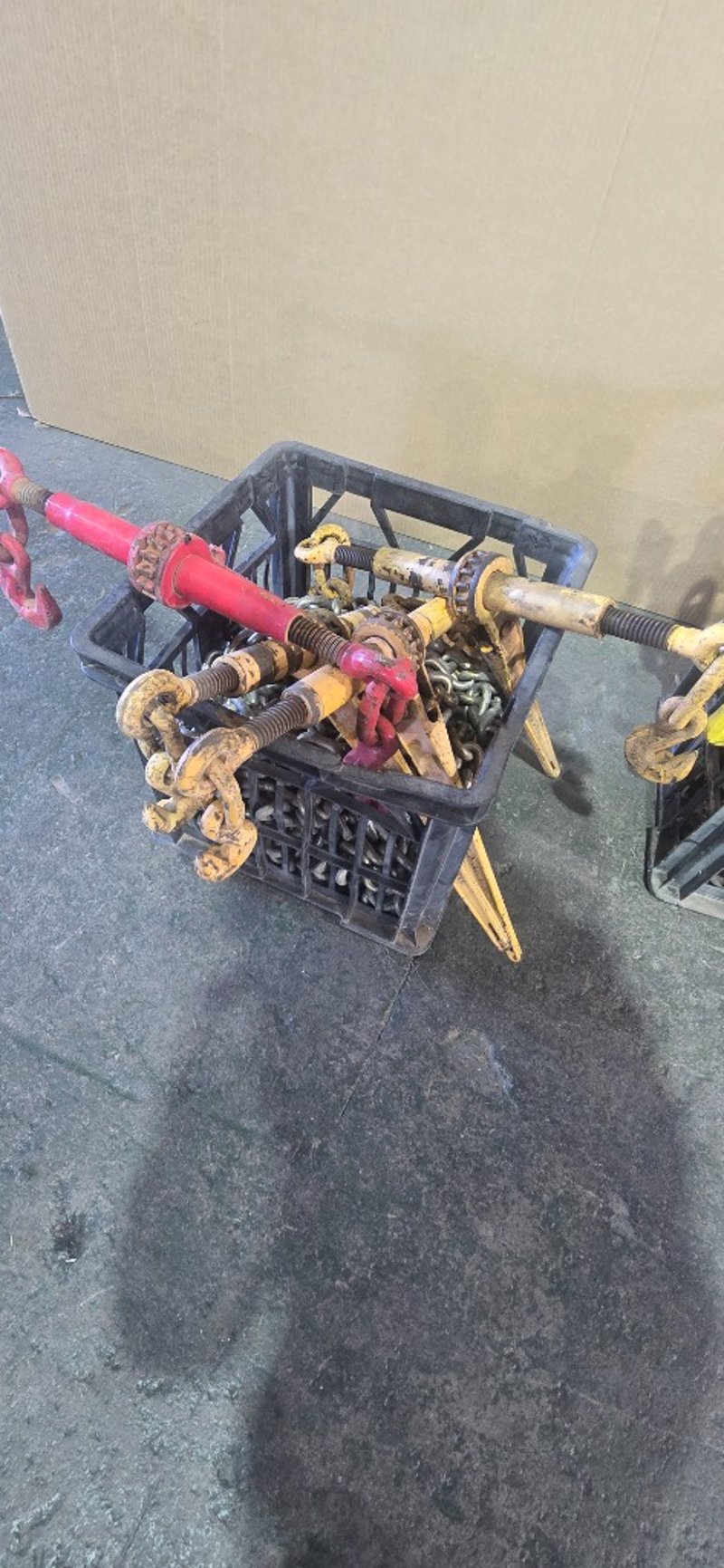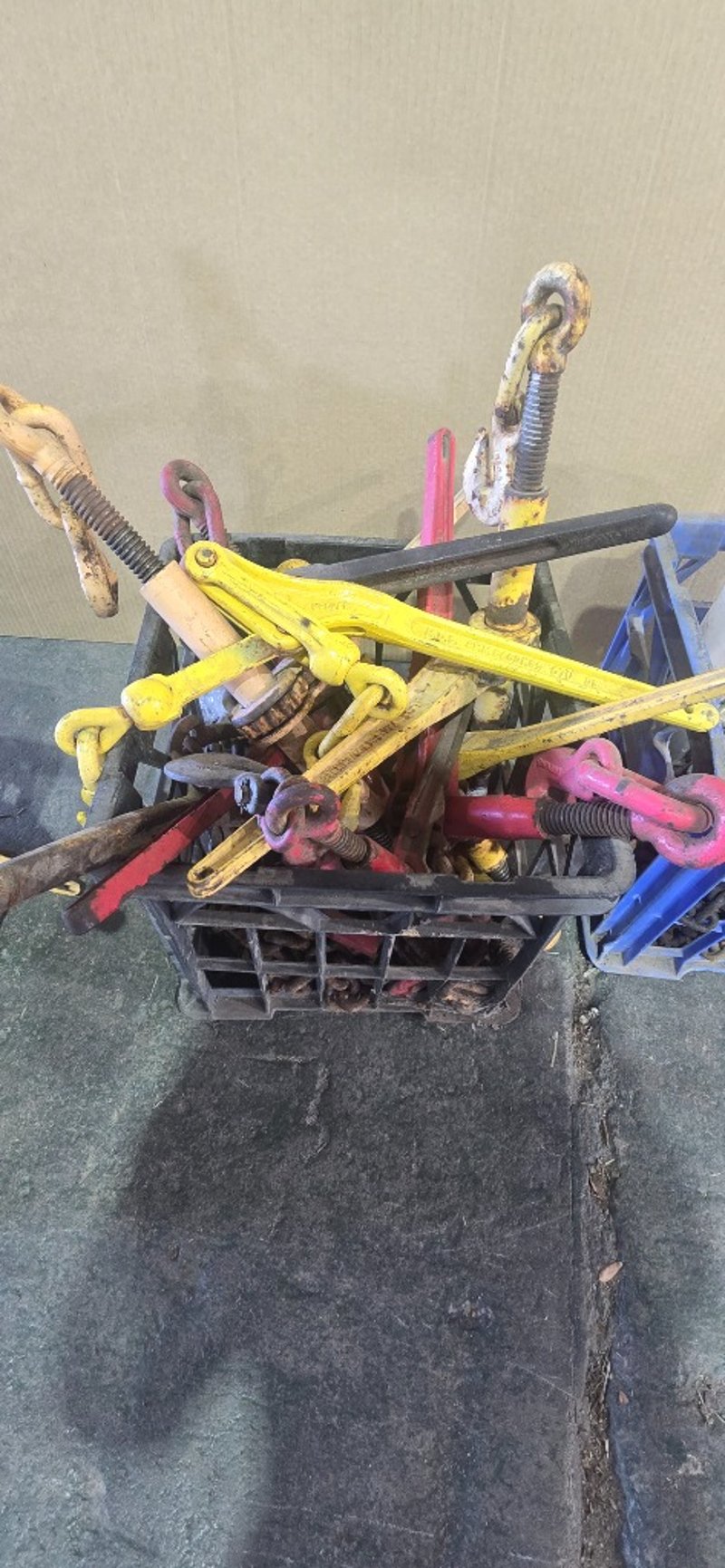 ratchet load binders and metal chains, assorted styles and sizes Sold as lot