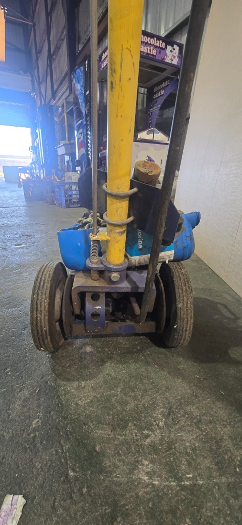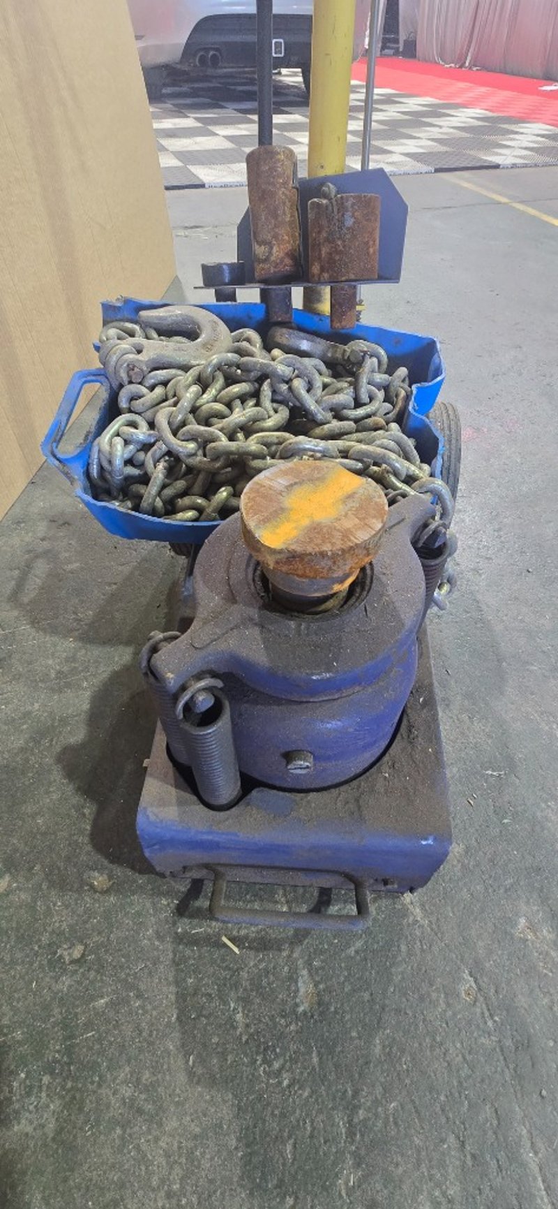 Air-operated hydraulic bottle-style floor jack and metal chains