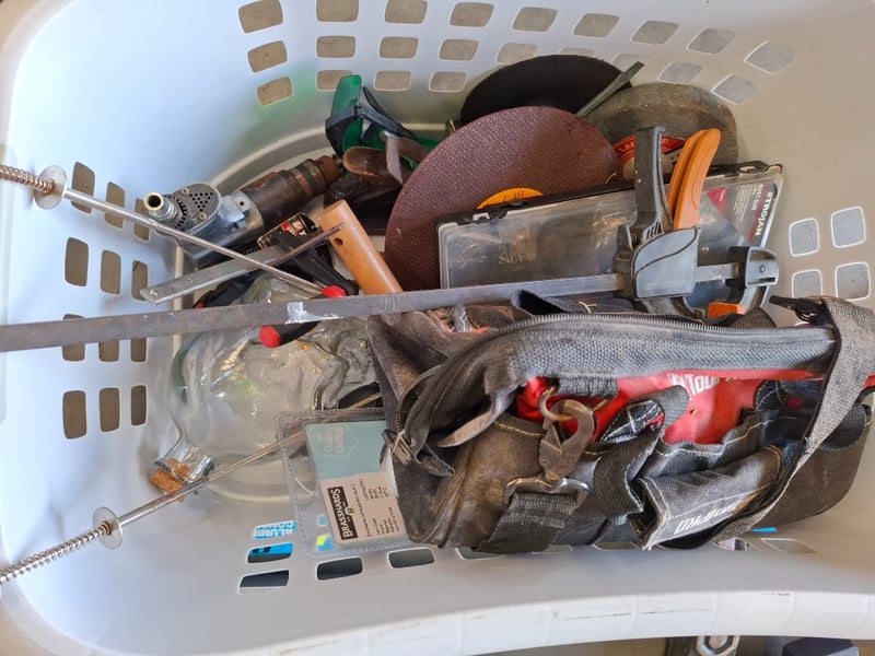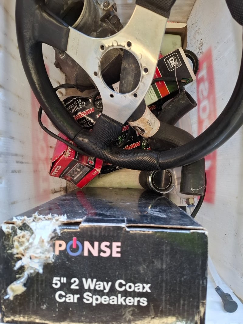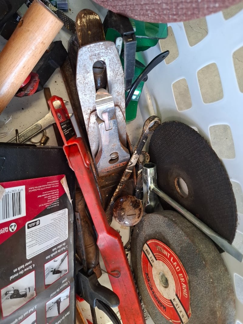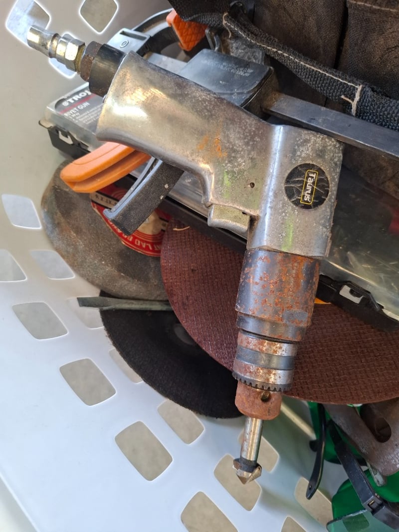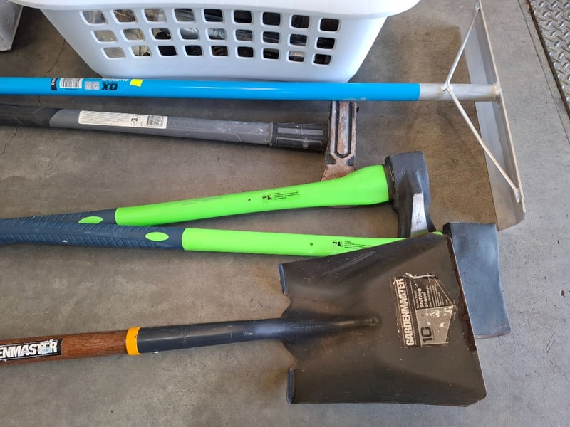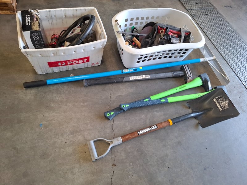 Assortment lot of tools and parts, includes air presure drill, shovel, axes, car steering wheel , hose and more, Sold as lot Note: inspection Recommended