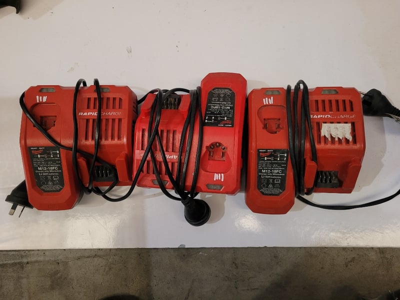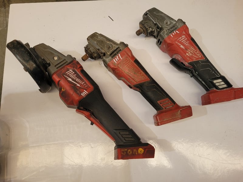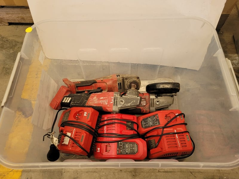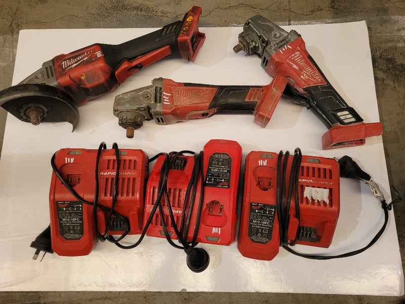 Milwaukee Grinders and Chargers Note: Damaged, parts missing, unknown working condition