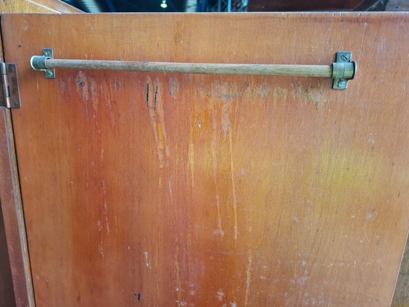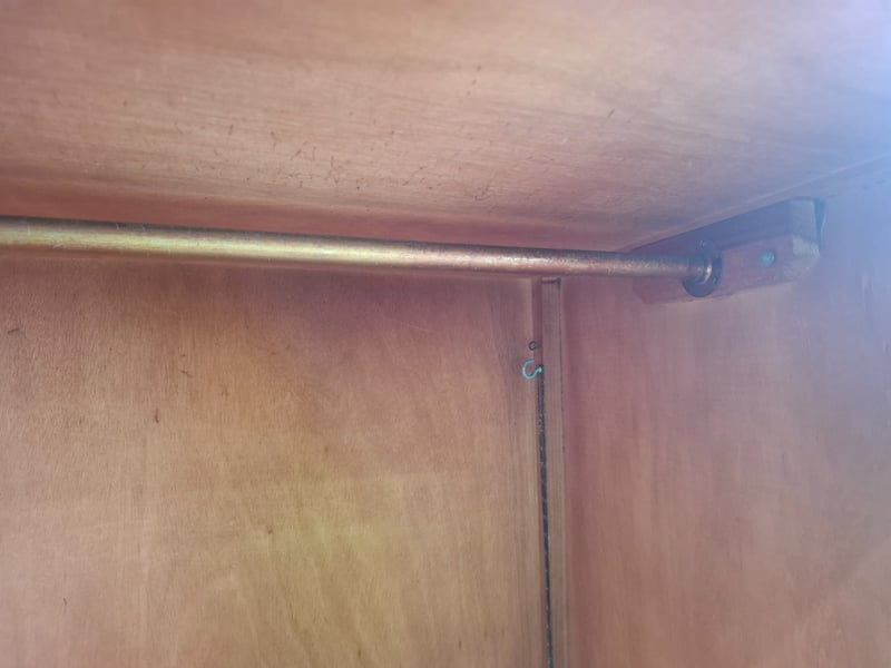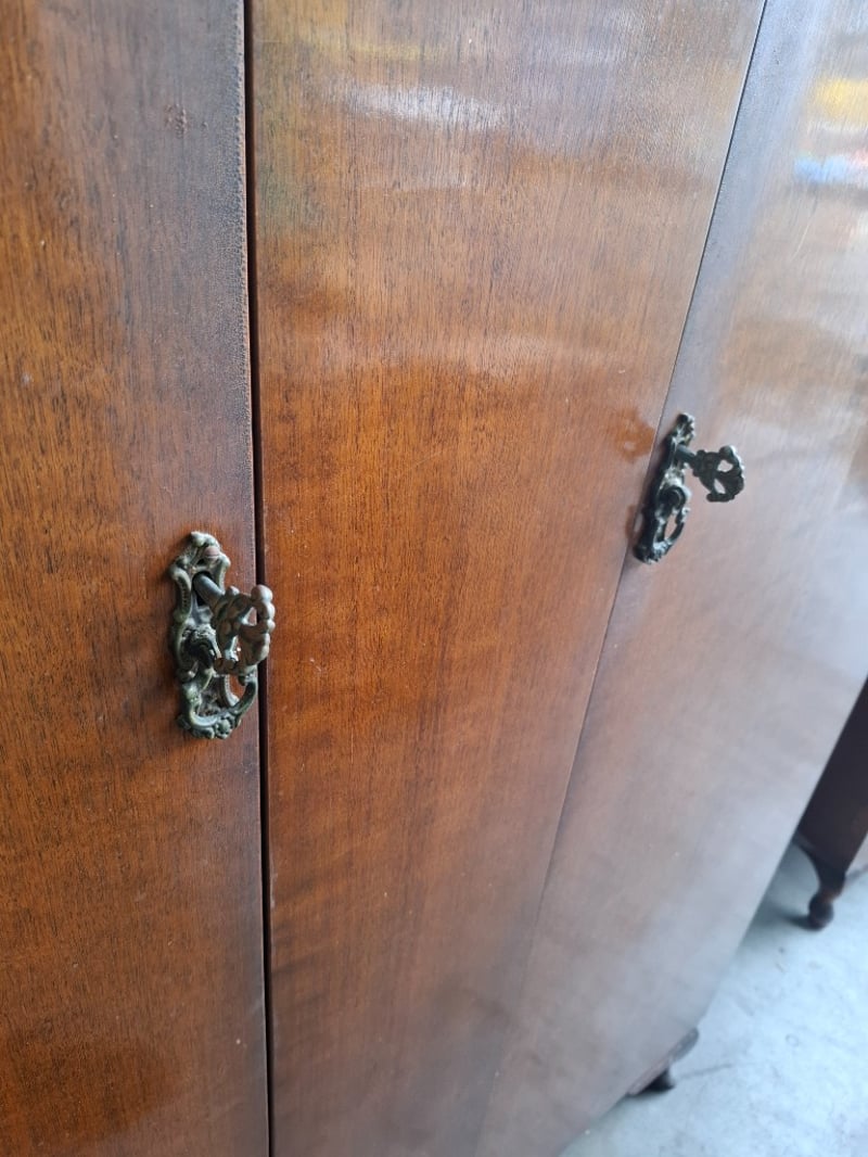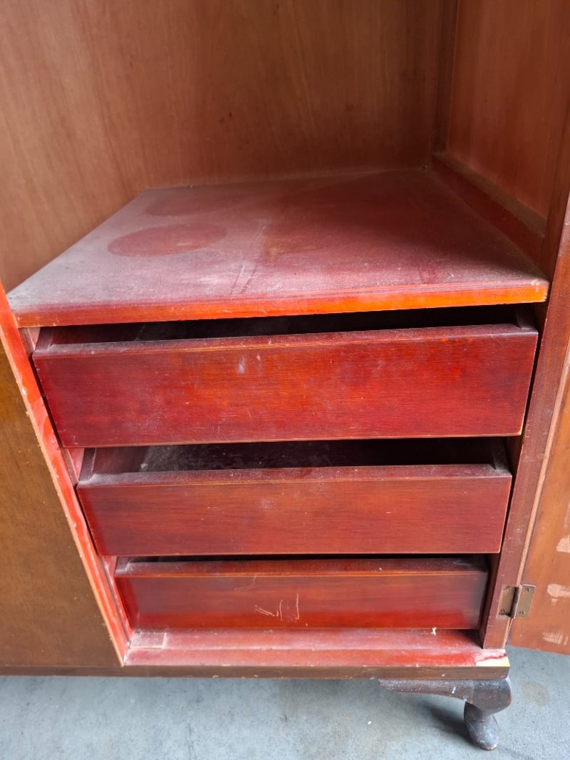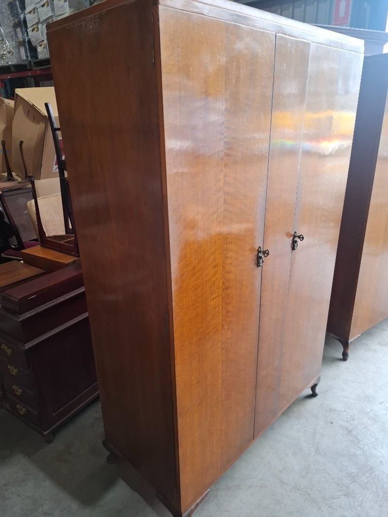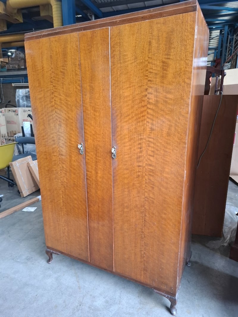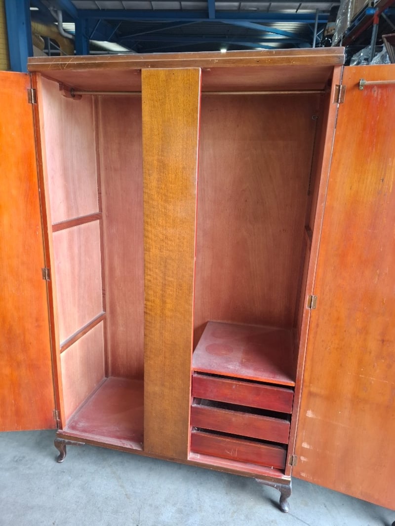 Timber wardrobe, 2 doors, 3 drawers, on timber feet Dimensions: 110cmW x 52cmD x 180cmH Note: Cleanning required, scratches